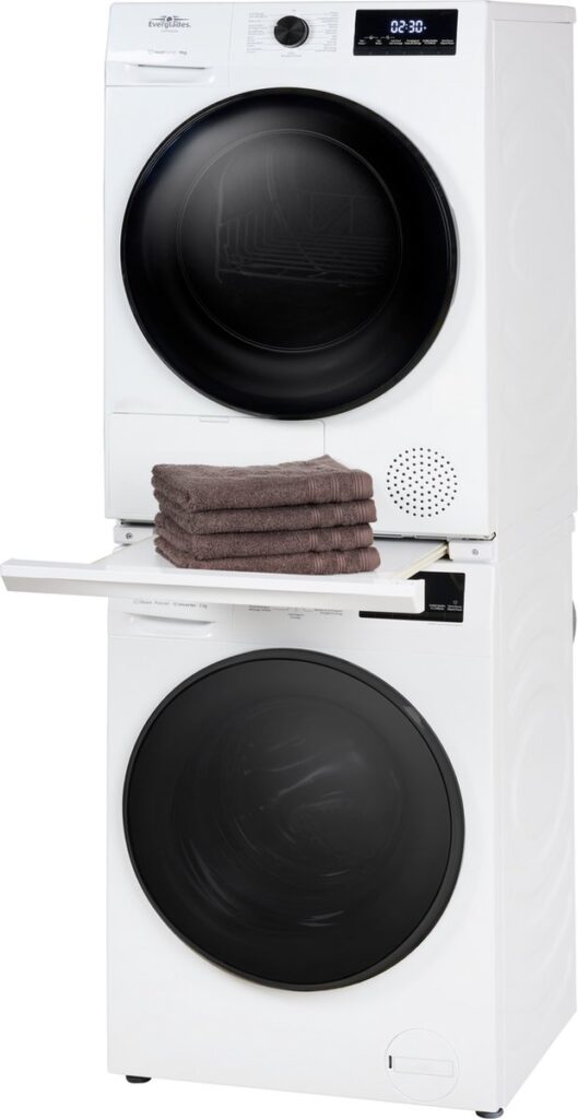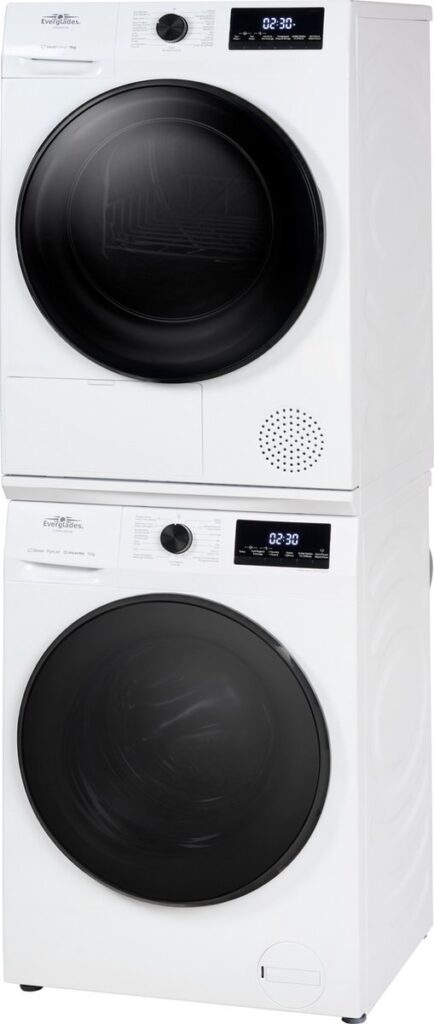 Esthetisch ontwerp: De witte kleur van de Everglades EVSK9001W stapelkit past perfect bij de wasautomaat en warmtepompdroger, waardoor een uniforme en esthetisch aantrekkelijke uitstraling ontstaat in uw wasruimte.