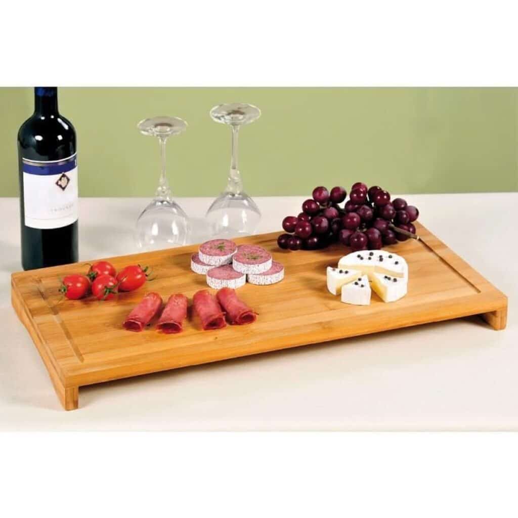 Je kookt graag en gebruikt daarvoor het liefst frisse ingrediënten? Dan ken je het zeker dat je op een klein plankje aan het snijden bent en je de producten in een ander bakje moet opslaan voordat het allemaal in de pan komt. Op deze Fsc bamboe snijplank heb je genoeg plek groente of vlees te snijden of deeg uit te rollen. Naast dat de snijplank functioneel is, is hij ook erg mooi. Hij heeft een saprand voor het opvangen van sappen van bijvoorbeeld tomaten. Ook ideaal voor broodkruimels die anders op het aanrecht zouden belanden. Aan de zijkant zijn twee inhammen waardoor je deze beter kunt dragen. Doordat het snijplankje verhoogt is, is hij ook ideaal als fornuisafdekking te gebruiken om zo meer plek te creëren. Kunststof nopjes zorgen ervoor dat geen krassen op het kookveld komt. De snijplank is van bamboe, wat een milieuvriendelijke en snel groeiende grondstof is. Dankzij de bijzondere eigenschappen van bamboe is het materiaal uiterst geschikt als snijplank en decoratief keukengerei. Het materiaal is extreem hard en voorkomt dat mesbladen bot worden. Het unieke patroon in het hout geeft het geheel een mooie uitstraling. De snijplank kan schoon gemaakt worden door deze met warm water en sop af te spoelen en daarna goed te laten drogen. Details snijplank met saprand • Afmeting: 54 x 28 x 4,3 cm • Gewicht: 1,5 kg • Materiaal: FSC Bamboe • Kleur: Natuur Bamboe snijplank als fornuis afdekplaat • Als afdekplaat, snijplaat of dienblad te gebruiken • Om vlees, fruit, groenten etc. op te snijden • Saprand vangt spa op en zorgt ervoor dat aanrecht schoon blijft • Messenvriendelijk en hygiënisch • Door hoge dichtheid zeer duurzaam • Decoratie is bij de levering niet inbegrepen.