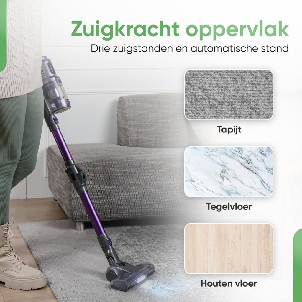 Deze veelzijdige steelstofzuiger biedt niet alleen gemak dankzij zijn LED-verlichting, maar ook door zijn aanpasbare zuigkracht. Met drie verschillende zuigkrachtniveaus kunnen gebruikers de reinigingsprestaties afstemmen op de specifieke behoeften van hun vloeren of oppervlakken. Of het nu gaat om het snel opruimen van kruimels op een harde vloer, het grondig reinigen van tapijten of het zachtjes verzorgen van delicate oppervlakken, de steelstofzuiger past zich flexibel aan voor een optimale schoonmaakervaring.