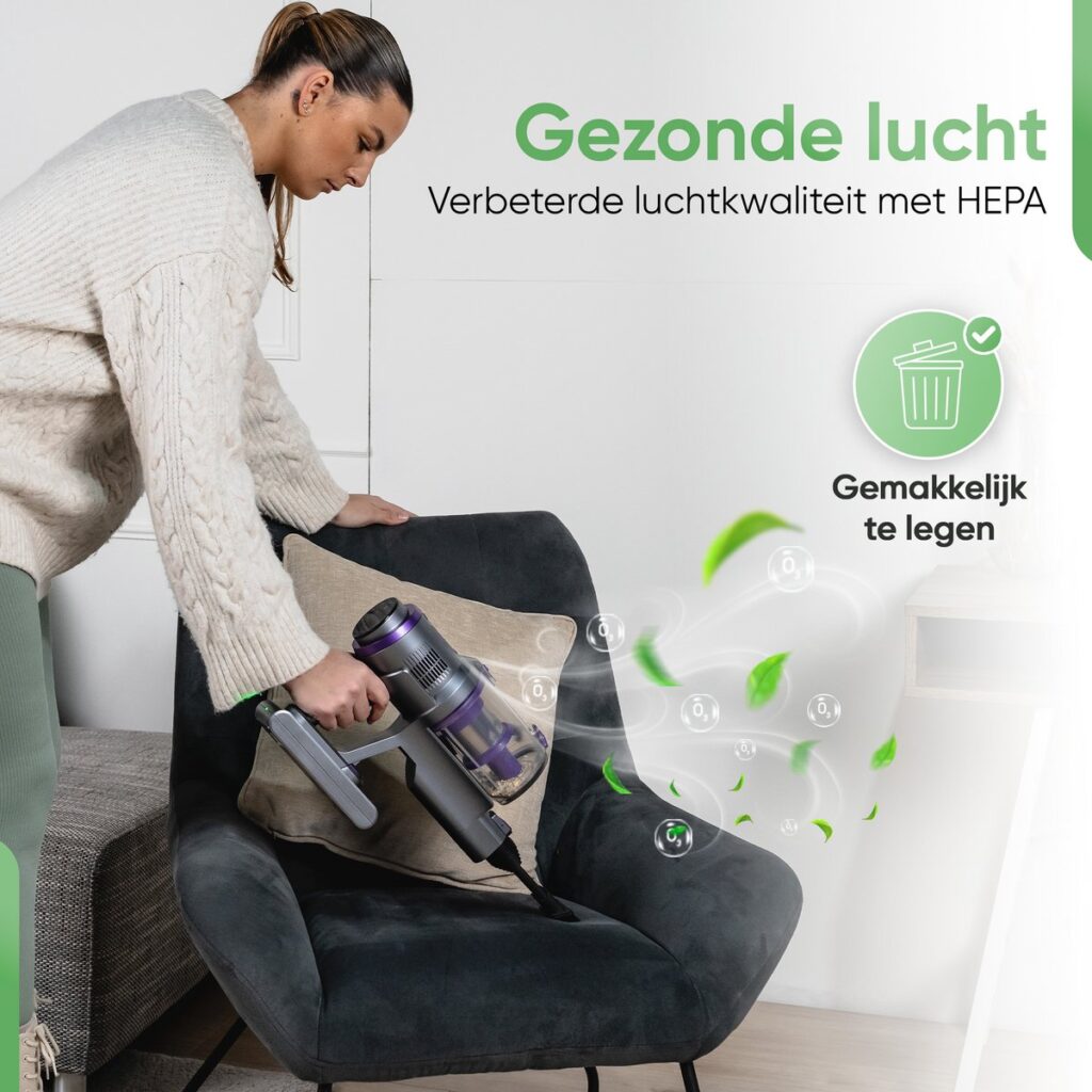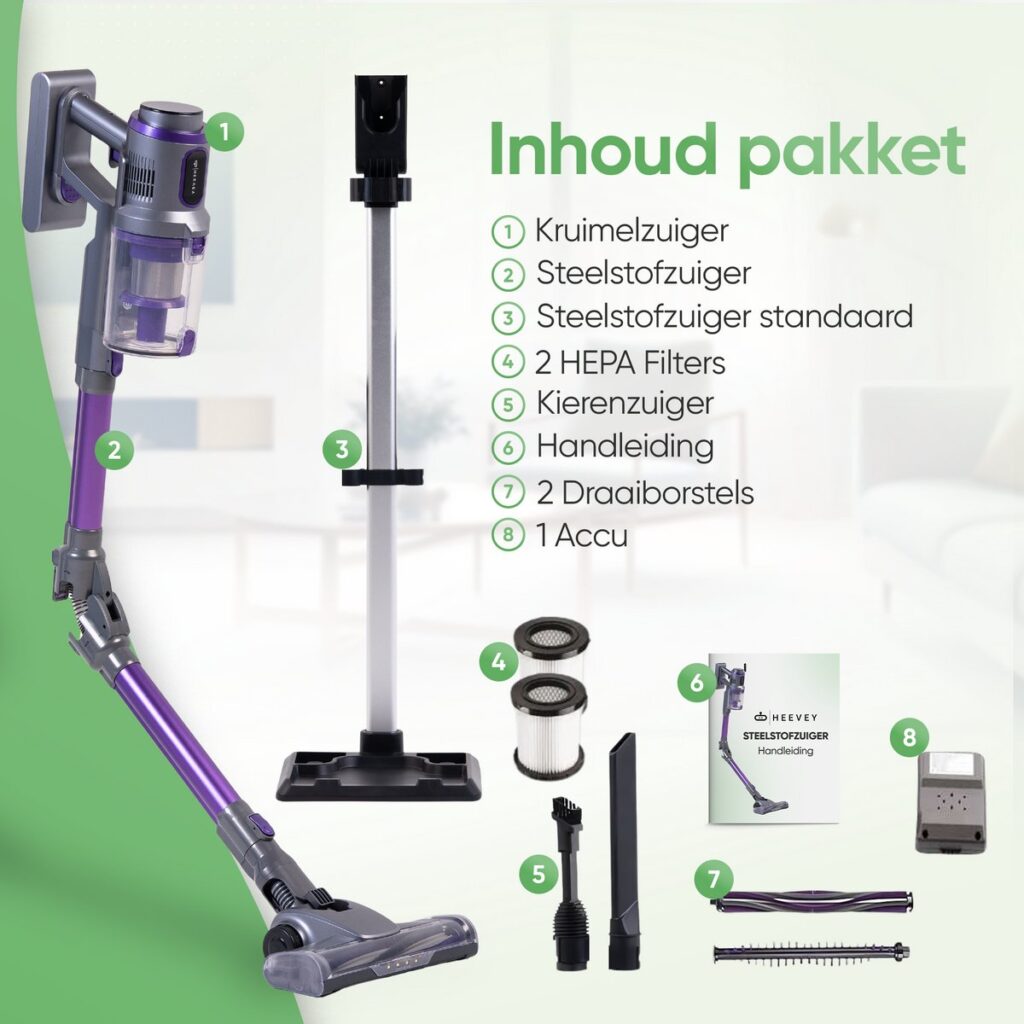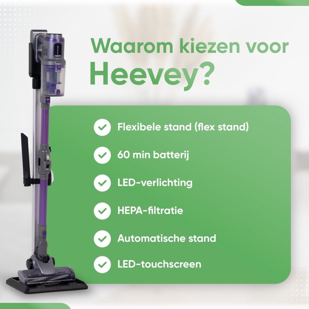 De Heevey draadloze steelstofzuiger is geschikt voor het reinigen van alle soorten oppervlakken, inclusief vloeren, tapijten, meubels, trappen en de binnenkant van auto’s. Door het lichte ontwerp is deze stofzuiger gemakkelijk te gebruiken en zeer geschikt voor het schoonmaken van moeilijk bereikbare plaatsen.