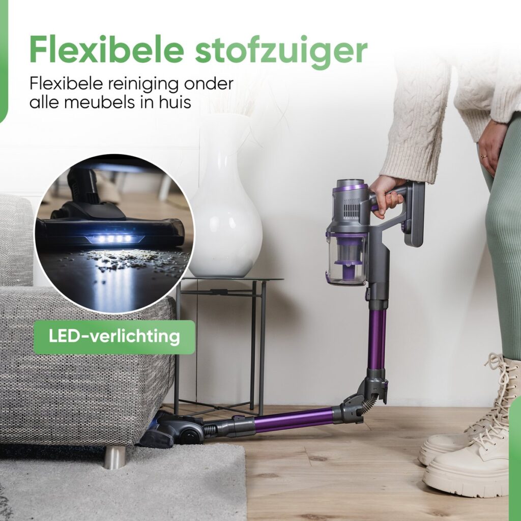 Het flexibele ontwerp van de Heevey draadloze steelstofzuiger maakt het gemakkelijk om zelfs de moeilijkste plekken te bereiken. Door de slanke en lichte constructie kan je deze stofzuiger gebruiken om zowel de vloeren als de meubels schoon te maken. Dankzij de inbegrepen accessoires, zoals de 2-in-1 crevice mondstuk en de lange crevice mondstuk, kan je de stofzuiger ook gebruiken om smalle ruimtes en hoeken schoon te maken. Het ontwerp van de stofzuiger zorgt ervoor dat je in staat bent om snel en gemakkelijk schoon te maken zonder enige beperkingen. Verder beschikt de steelstofzuiger over een flexstand. Hiermee kan je gemakkelijk onder lage meubels stofzuigen.