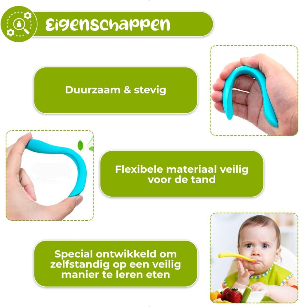 Twee bewaarbakjes inclusief vier kleurrijke lepels die speciaal ontworpen zijn voor kinderen die zelfstandig willen leren eten. De siliconen lepels hebben een zachte boord waardoor hapjes extra veilig zijn voor de doorkomende tandjes. De lepels zijn BPA-vrij en gemaakt van hoogwaardig materiaal en geschikt voor magnetron, vaatwasser en diepvries.