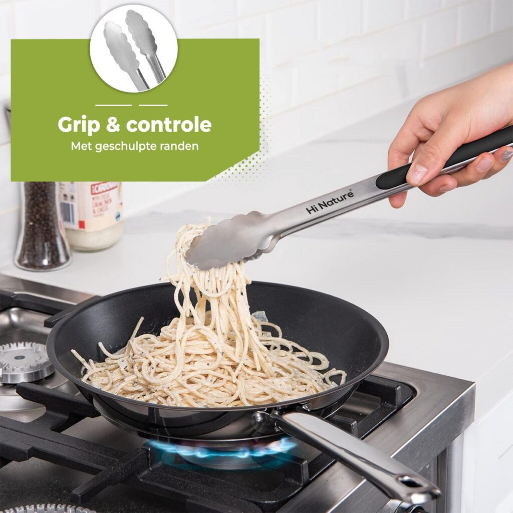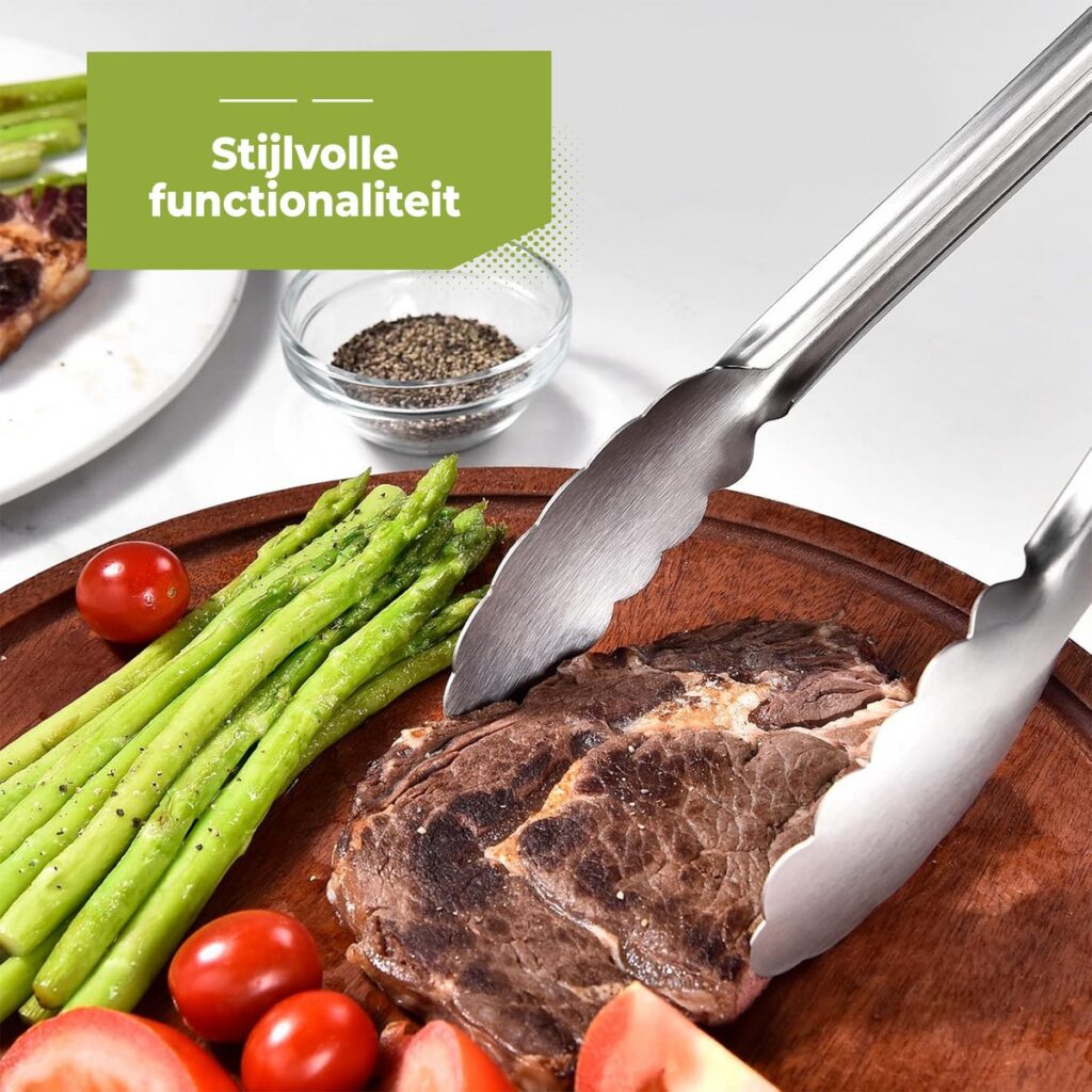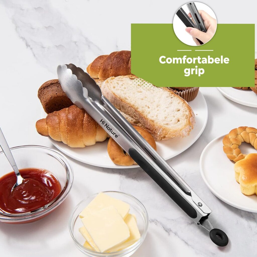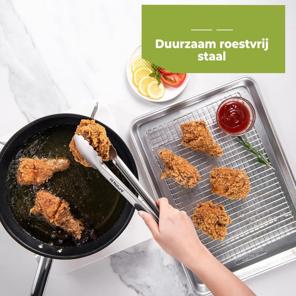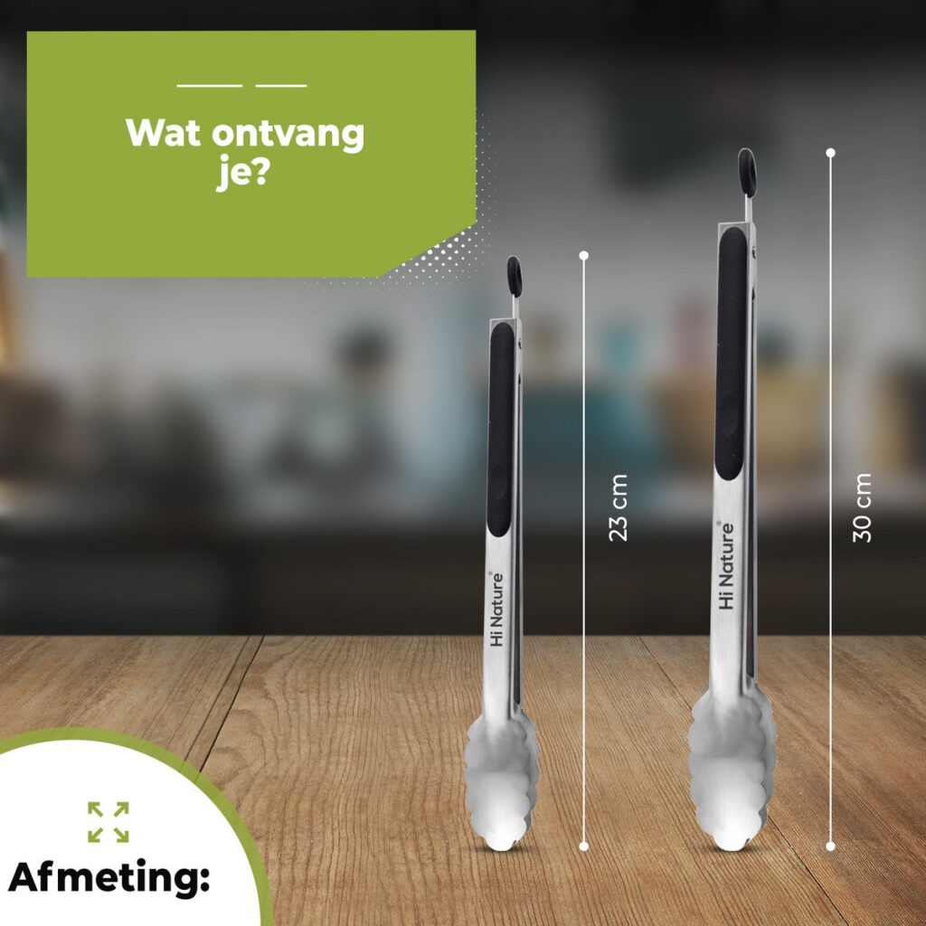 Ben jij klaar om jouw BBQ-ervaring naar een hoger niveau te tillen? De HI NATURE™ Barbecuetangen zijn dé onmisbare keukentangen voor elke grillmaster en kookliefhebber! Deze premium tangenset bevat twee tangen van 23 cm en 30 cm, perfect voor het omdraaien van vlees, het serveren van gerechten en het mengen van salades. Dankzij het hittebestendige en antislip ontwerp heb je altijd volledige controle over je eten, zowel op de BBQ als in de keuken. Of je nu een zomerse barbecue organiseert of een heerlijke maaltijd bereidt, met deze roestvrijstalen keukentangen ben je verzekerd van gemak en precisie.