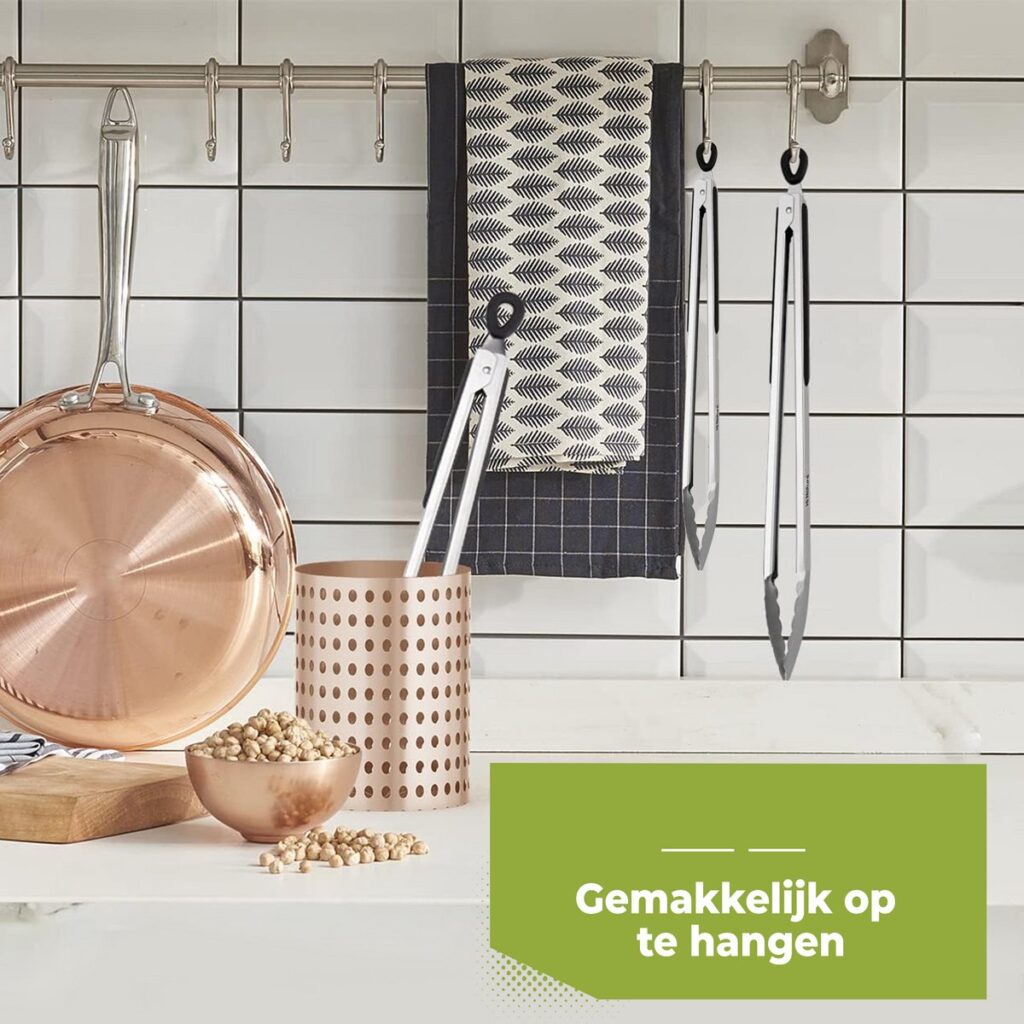 Dankzij het slimme vergrendelmechanisme kun je de tangen eenvoudig opbergen zonder dat ze veel ruimte innemen. De ophanghaak zorgt ervoor dat je ze altijd binnen handbereik hebt in de keuken of bij de BBQ.