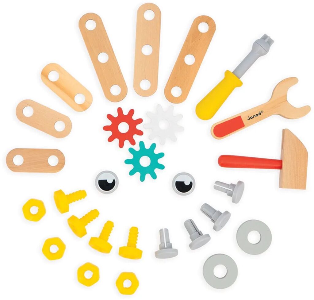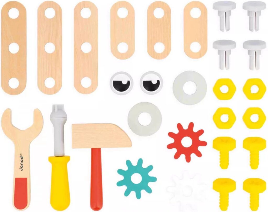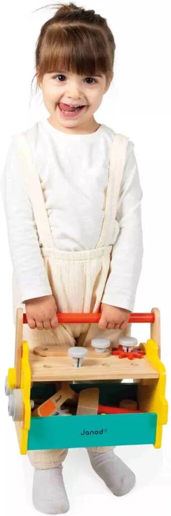 Is het een gereedschapskist, robot of kleine werkbank? Laat de kinderen beslissen! Met deze gereedschapskist kunnen kinderen vanaf 3 jaar genieten van leuk, modulair constructiespeelgoed. Het ideale hulpmiddel om hun creativiteit en motorische vaardigheden te stimuleren, terwijl ze net als papa of mama aan het knutselen zijn! Dit bouwspel wordt geleverd met alles wat onze kleine doe-het-zelvers in de dop nodig hebben, zoals: 3 gereedschappen (schroevendraaier, moersleutel, hamer), 13 houten stukken (planken, tandwielen) en 14 hardware-elementen (schroeven, spijkers). Dat zijn 30 accessoires in totaal! Hierdoor kunnen kinderen eindeloos ingenieuze machines uitvinden, terwijl ze hun behendigheid en verbeelding ontwikkelen. Bovendien zijn de schroeven ingekeept om de echte beter na te bootsen en de kleintjes een realistische speelervaring te bieden.