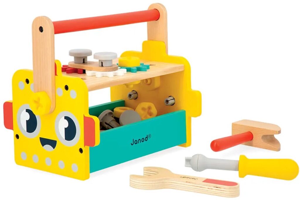 Een ander hoogtepunt van deze gereedschapskist voor kinderen is de afneembare handgreep: hij kan naar believen in elkaar gezet en uit elkaar gehaald worden! Dit maakt het vervoer eenvoudig en doe-het-zelvers zijn altijd voorbereid om op de bouwplaats aan de slag te gaan. Als het handvat is verwijderd, wordt ons doe-het-zelf-spel een compacte houten werkbank waarop allerlei elementen kunnen worden gemonteerd! Maar dat is nog niet alles! Omdat robots synoniem zijn met vindingrijkheid en plezier in het maken, hebben we grappige ogen toegevoegd die je kunt bevestigen of mengen om de gezichtsuitdrukking van onze kleine vriend te veranderen. Dit doe-het-zelf-speelgoed – dat zowel dienst doet als gereedschapskist of kleine houten werkbank – helpt kinderen hun creativiteit, oog voor detail en behendigheid te ontwikkelen. Het is ook een geweldig speelgoed om te doen alsof voor degenen die graag repareren of creëren zoals de volwassenen.