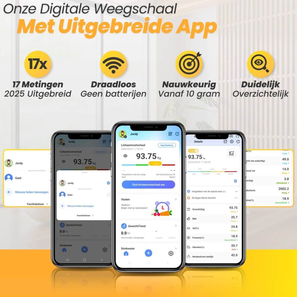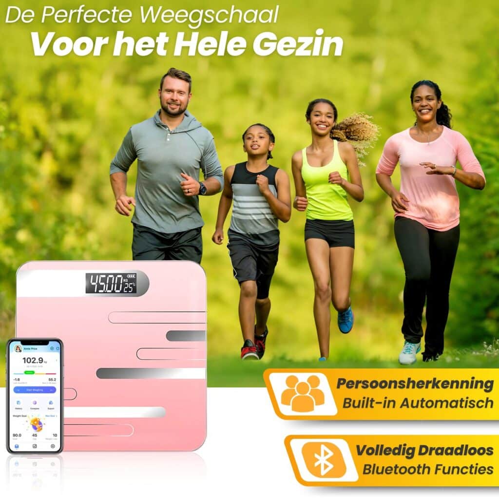 De weegschaal kan gegevens opslaan voor maximaal 8 verschillende gebruikers en herkent automatisch wie er op staat. Dit maakt het ideaal voor gezinnen of huisgenoten die elk hun eigen gezondheidsgegevens willen bijhouden zonder handmatige instellingen.