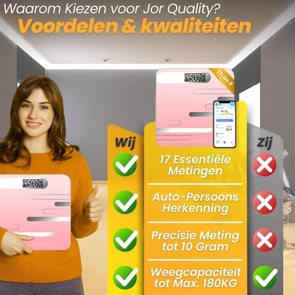 Met de Jor Quality Digitale Weegschaal haal je een slimme, stijlvolle en betrouwbare weegschaal in huis waarmee je jouw gezondheid eenvoudig en nauwkeurig kunt monitoren!