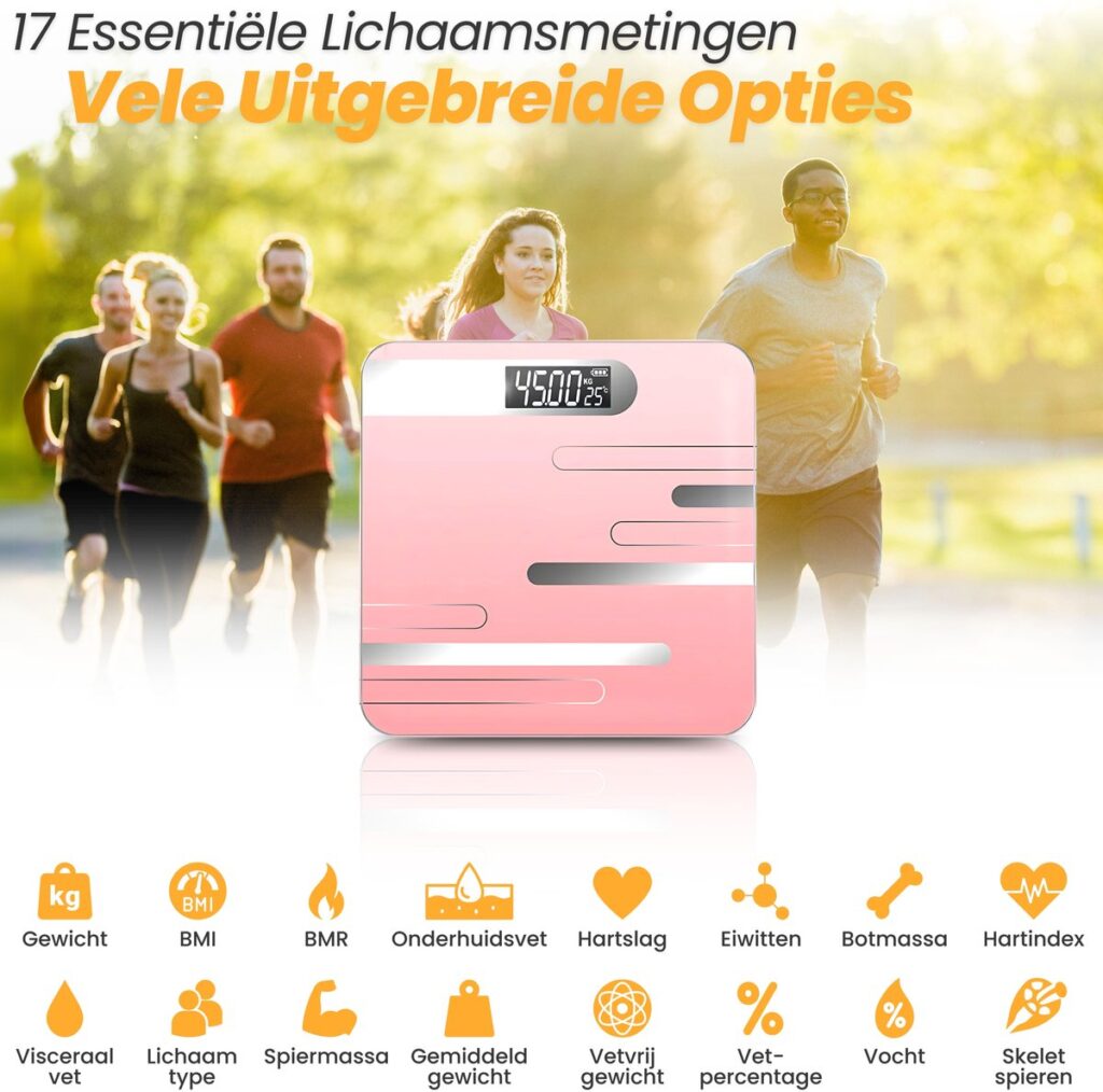 De Jor Quality Digitale Personenweegschaal is een geavanceerde en stijlvolle weegschaal die meer biedt dan alleen het meten van je gewicht. Met 17 essentiële lichaamsmetingen, waaronder BMI, vetpercentage, spiermassa en vochtgehalte, krijg je een uitgebreid inzicht in je gezondheid.