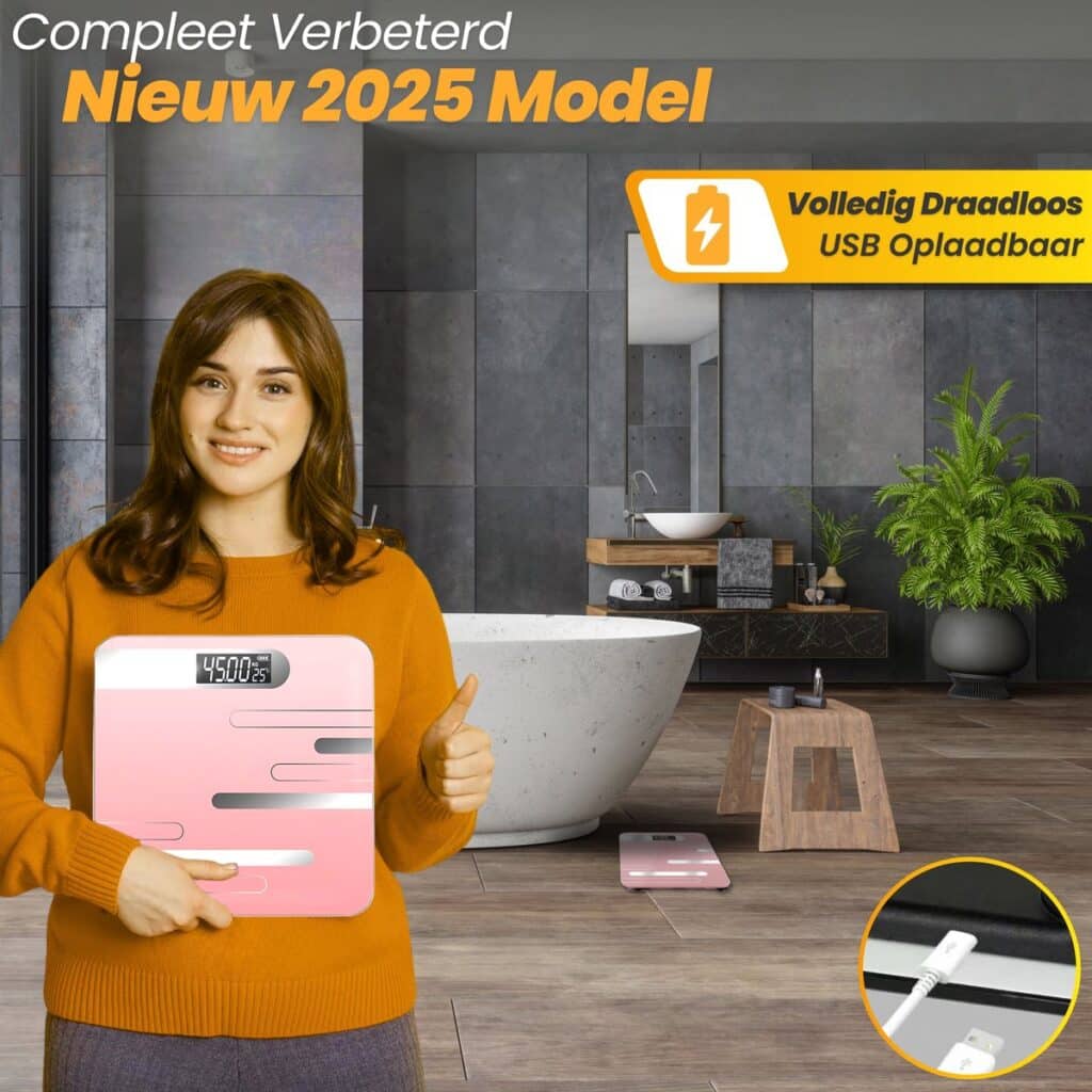 Deze digitale weegschaal werkt op een oplaadbare accu en heeft geen wegwerpbatterijen nodig. Dit maakt het niet alleen milieuvriendelijk, maar ook kostenbesparend. Opladen doe je eenvoudig via de meegeleverde USB-kabel, waardoor je altijd verzekerd bent van een werkende weegschaal.