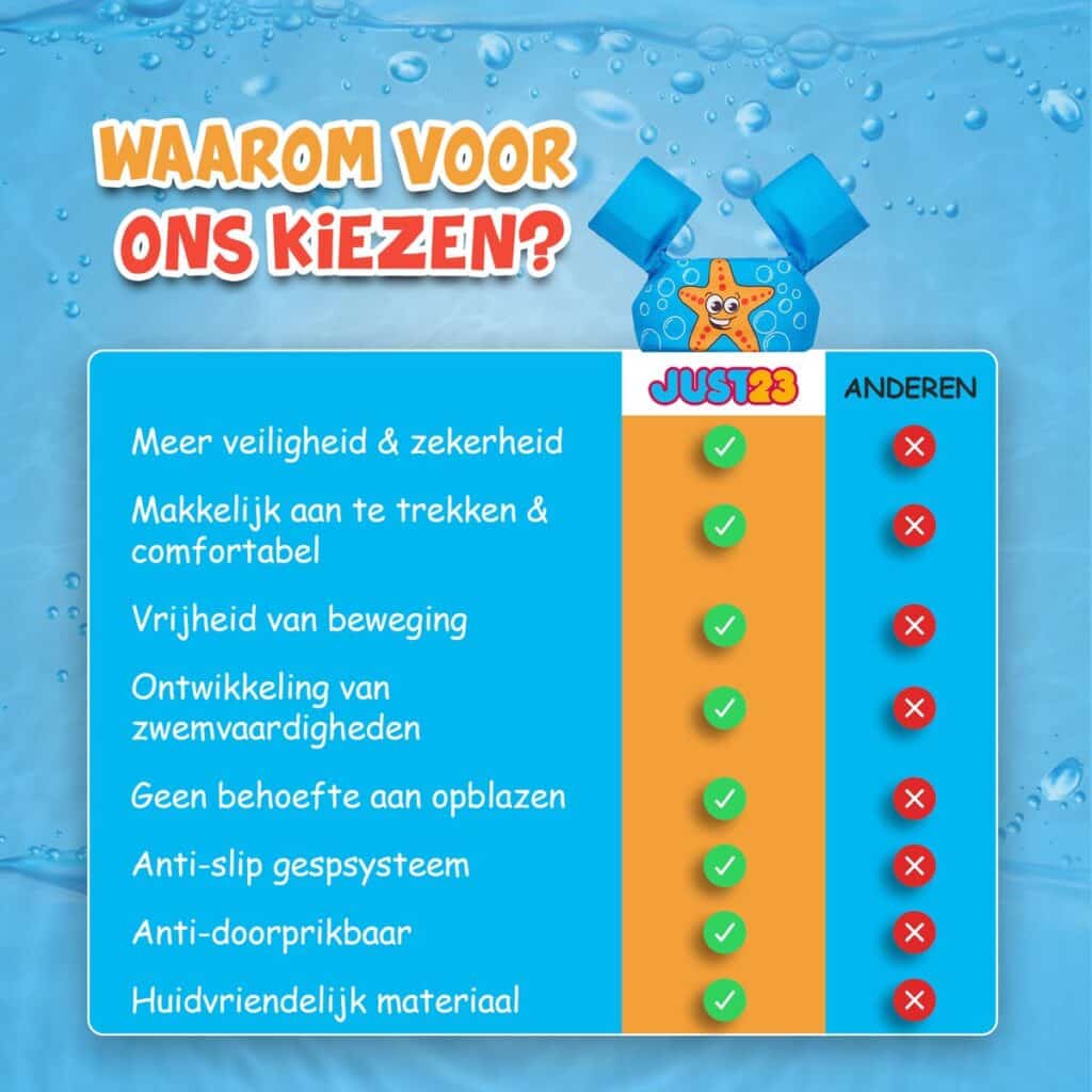 Zwemmen is een geweldige activiteit waar menig kind met veel plezier aan deelneemt. Als ouder kan het je helaas ook stress bezorgen: wat als er iets gebeurt? De JUST23 biedt hierin uitkomst. Door dit revolutionaire zwemvest kan jouw kind gemakkelijk boven water blijven, ook als jijzelf besluit een keer vanaf de kant toe te kijken. De JUST23 biedt zowel jouzelf als jouw kind de zekerheid dat ook zonder extra ondersteuning de veiligheid gegarandeerd is.