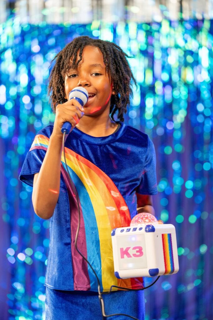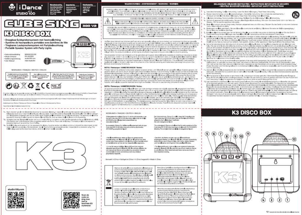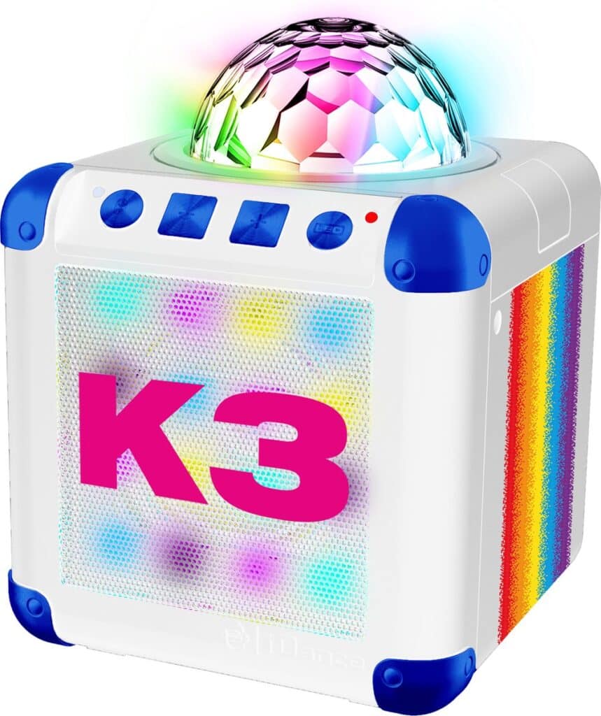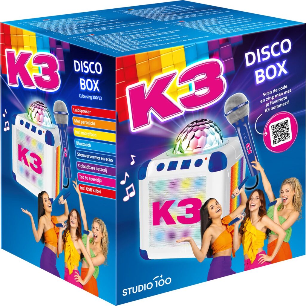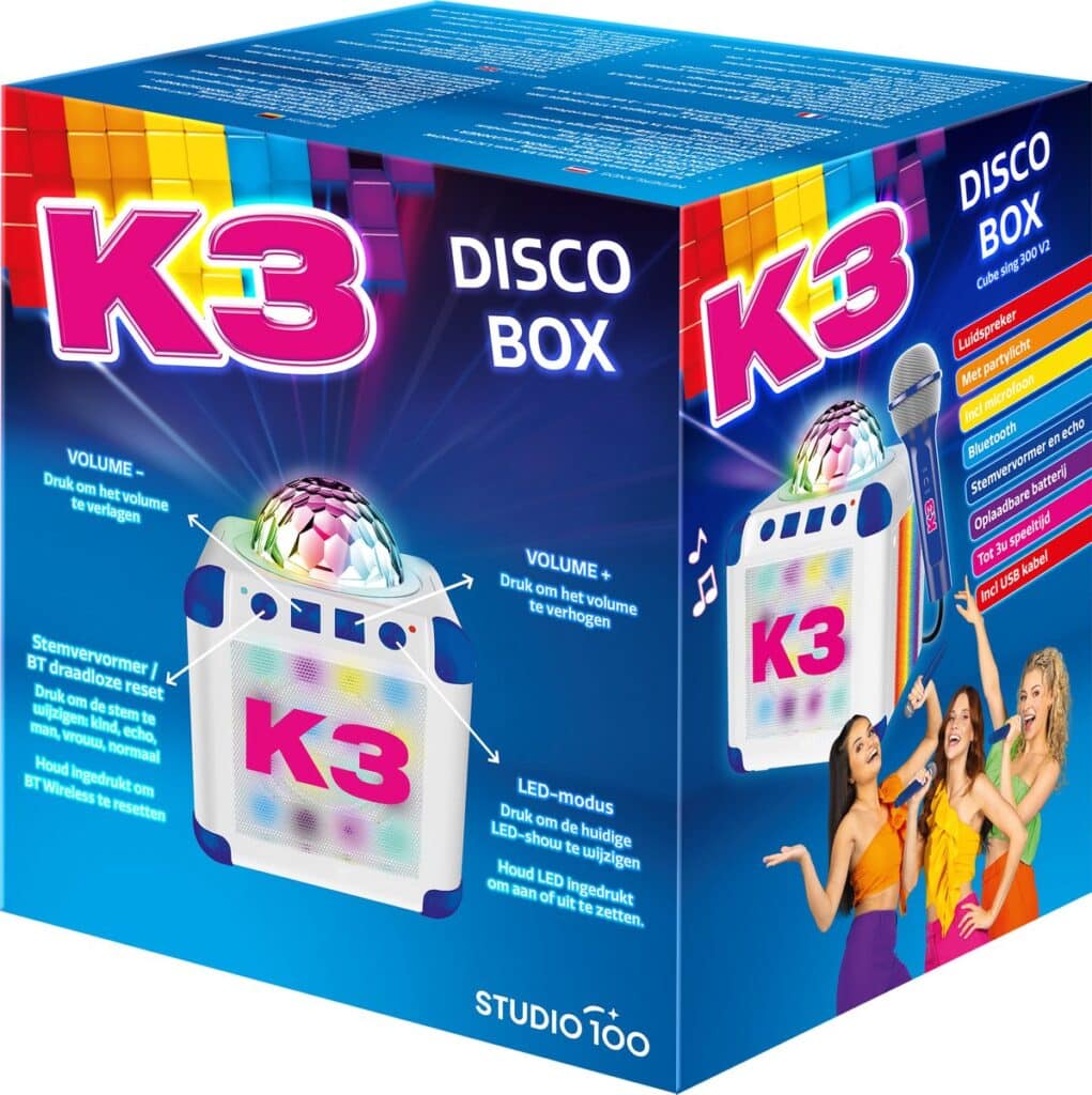 Het is elke dag feest met de K3 disco box! Laat je stem schijnen door de microfoon mét echofunctie en een stemvervormer die zorgen voor hilarische momenten. Het partylicht en de lichtshow geven elke ruimte een instant party vibe. Dankzij de bluetooth technologie kun je draadloos verbinding maken met je smartphone, tablet of ander Bluetooth apparaat. Scan de QR code op de verpakking of gebruiksaanwijzing en geniet van je favoriete K3 afspeellijst. Deze discobox is voorzien van een oplaadbare batterij en USB kabel.