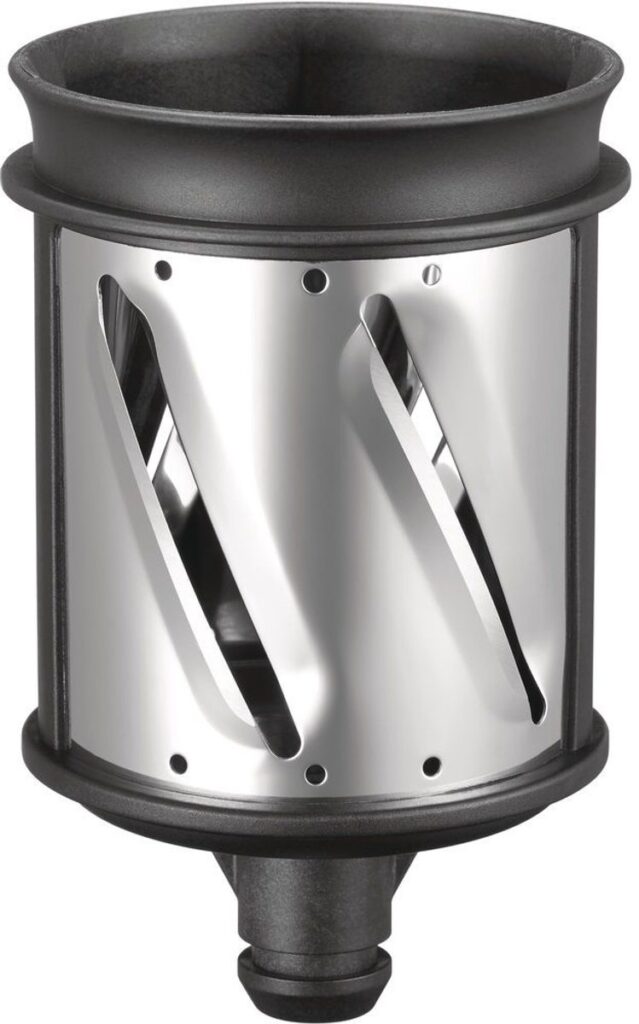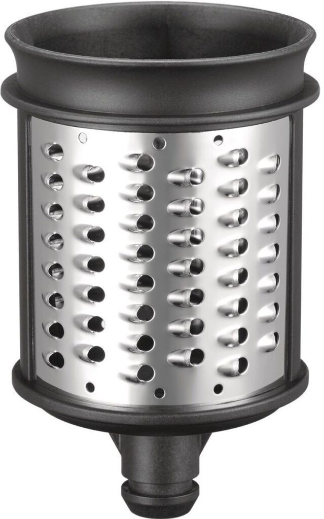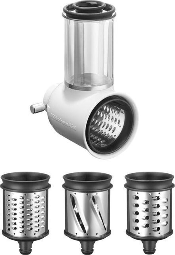 KitchenAid 5KSMVSA rolschaaf / rasp, ontworpen voor alle KitchenAid-keukenmachines. Bevestig het accessoire eenvoudig aan de enkele bevestigingshub aan de voorkant van de keukenmachine. Met dit accessoire kunt u wortels, rauwe groene groenten, aardappelen en uien snijden en raspen, evenals allerlei soorten fruit, noten, chocoladerepen voor toppings en kaas. – Materiaal cilinder: roestvrij staal.