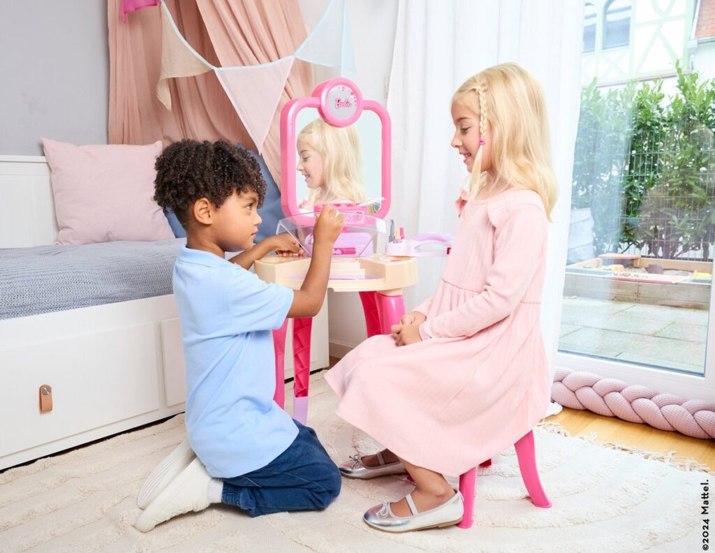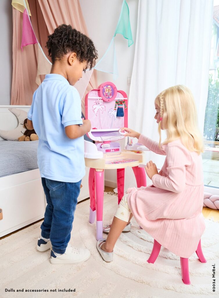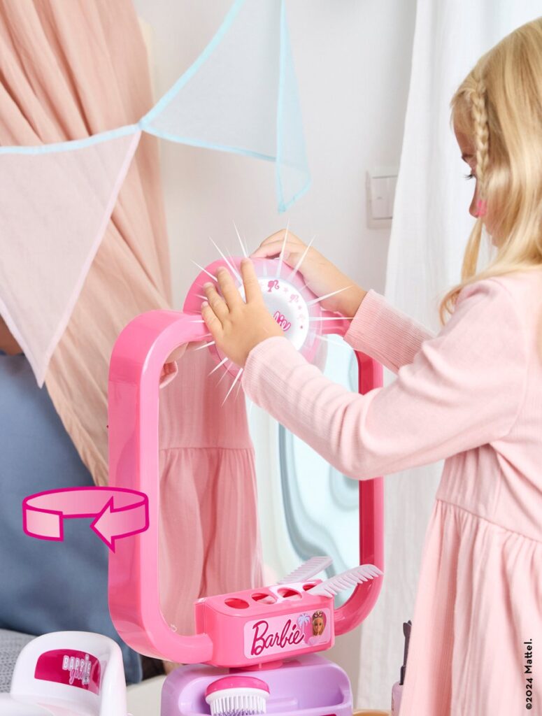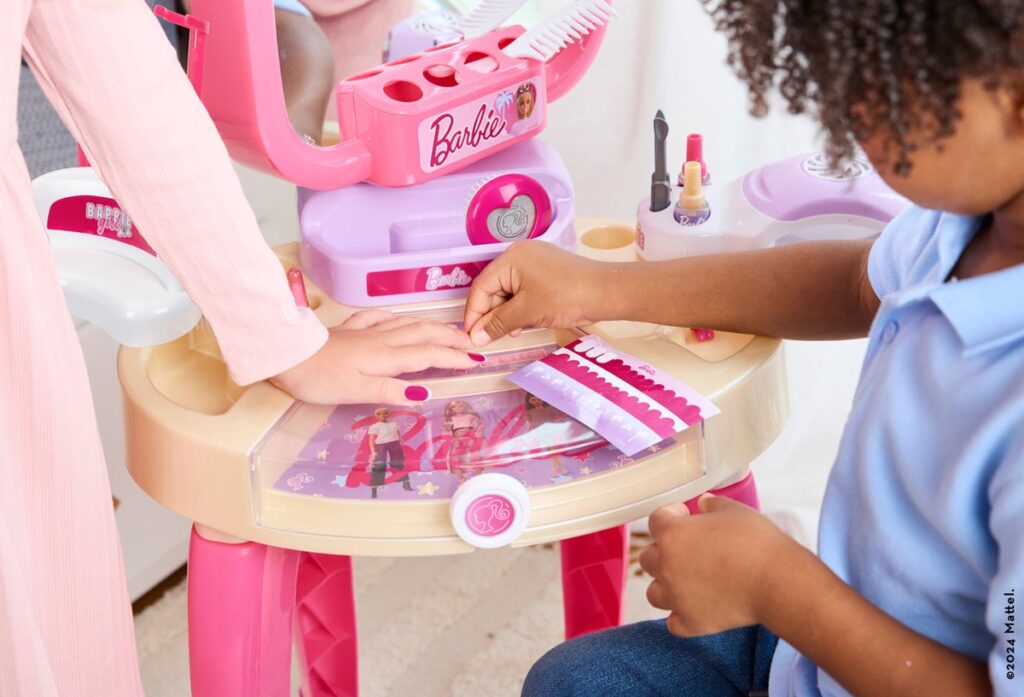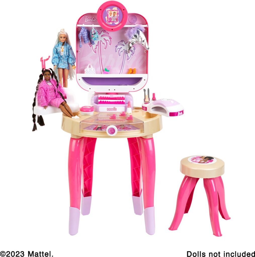 Van de Barbie-schoonheidsstudio ‘Happy Vibes’ gaan de harten van de kleintjes sneller kloppen. Hier kunnen toekomstige stylisten schitterende looks creëren. De kaptafel is voorzien van een draaibare spiegel, waardoor de kleintjes zichzelf van alle hoeken kunnen bekijken. Hierdoor kunnen ze de perfecte haarstijl creëren door te kammen, borstelen en haarclips te gebruiken. Daarna is het tijd voor de nagels. Ze worden verzorgd met een vijltje en nagelriembewerker en vervolgens versierd met nagellak. Vervolgens worden ze gedroogd met behulp van de nageldroger met lucht- en geluidseffecten. Tot slot wat lippenstift, en ze is helemaal kaar voor een romantisch etentje met Ken.