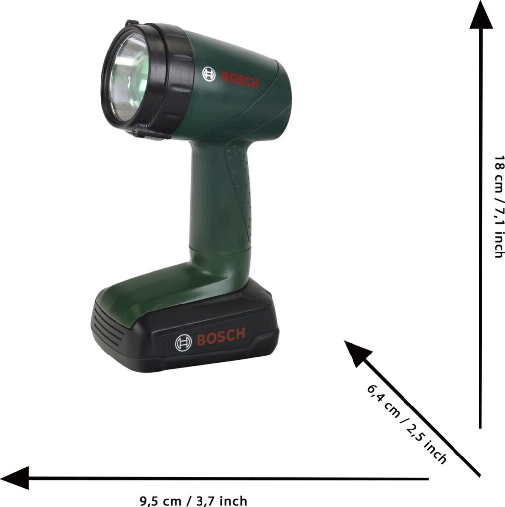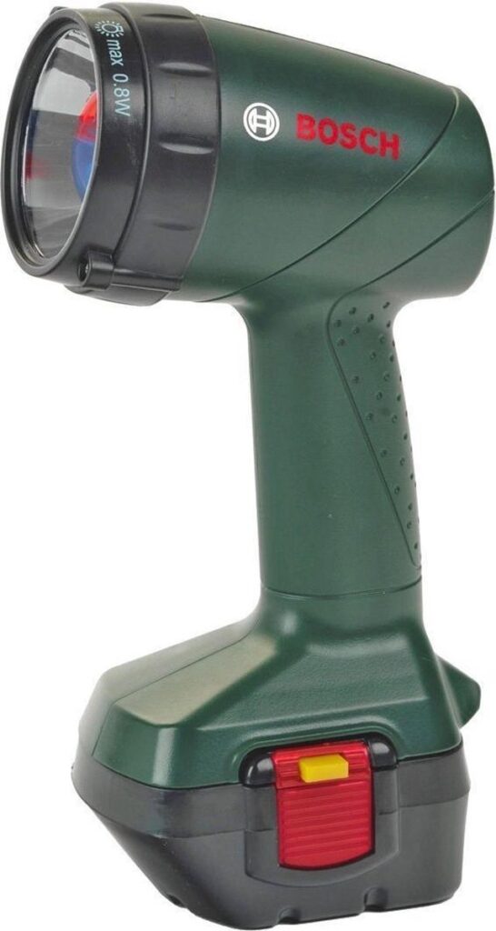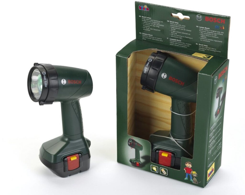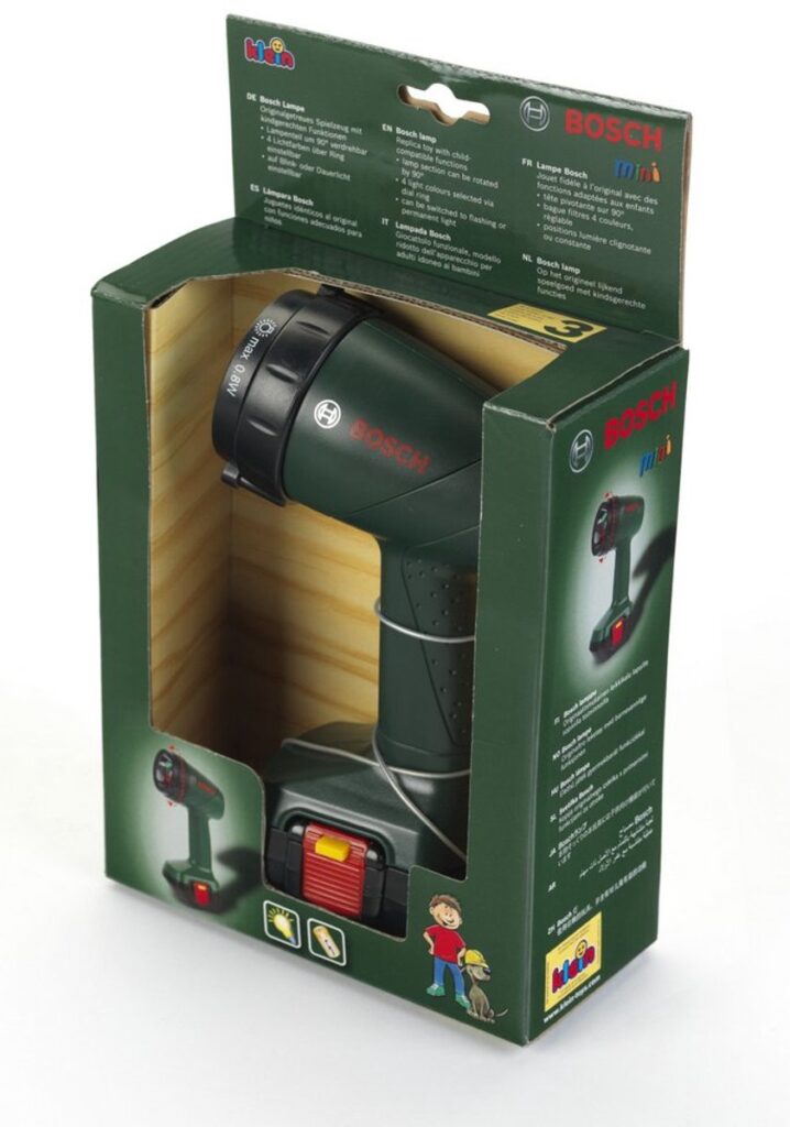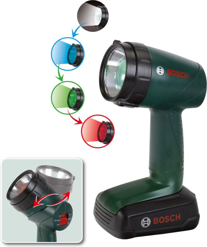 Waar hard wordt gewerkt moet voldoende licht zijn! Dat is geen enkel probleem met deze handige, op batterijen werkende lamp in Bosch-design van Theo Klein. De lamp kan 90 graden gedraaid worden en kan dus iedere werkplek perfect verlichten. Afhankelijk van de werkzaamheden kan zelfs de kleur van het licht worden aangepast: met behulp van een ring geeft de lamp niet alleen wit licht, maar ook blauw, groen en rood. De lamp kan in deze kleuren ook knipperen. Deze Bosch lamp is weldra niet meer weg te denken uit een professionele werkplaats in de kinderkamer, vooral omdat hij bij ontelbare spelletjes en avonturen ingezet kan worden, niet alleen bij het timmeren en knutselen. Door zijn stevigheid en hoogwaardige kwaliteit gaat de speelgoedlamp van Theo Klein heel lang mee.