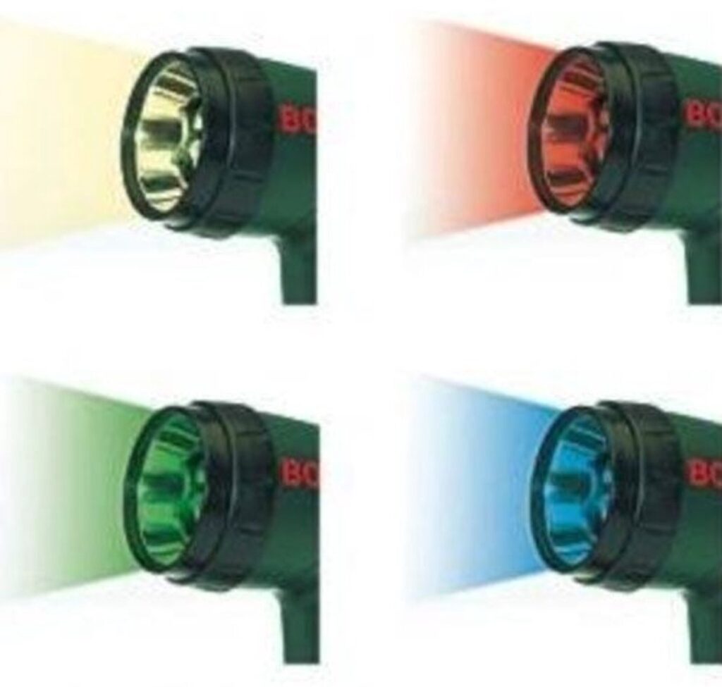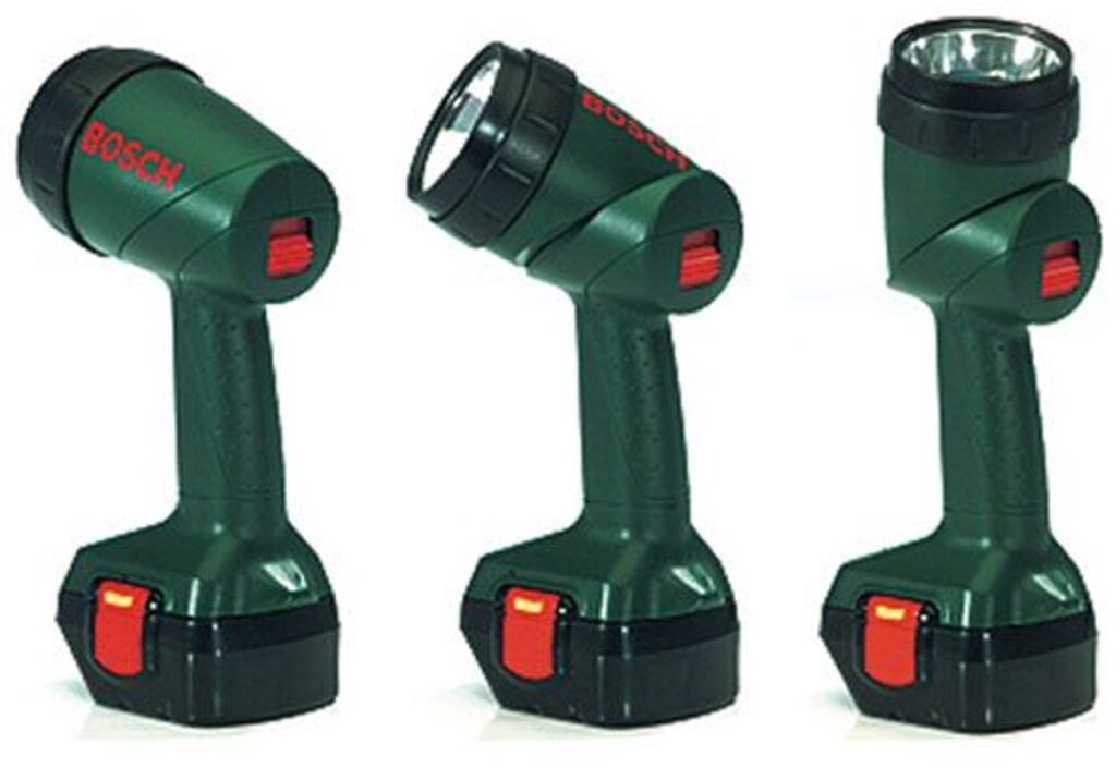 De lamp in Bosch-design kan 90 graden worden gedraaid, werkt op batterijen, geeft met behulp van een verstelbare ring licht in vier kleuren en kan ook knipperen.