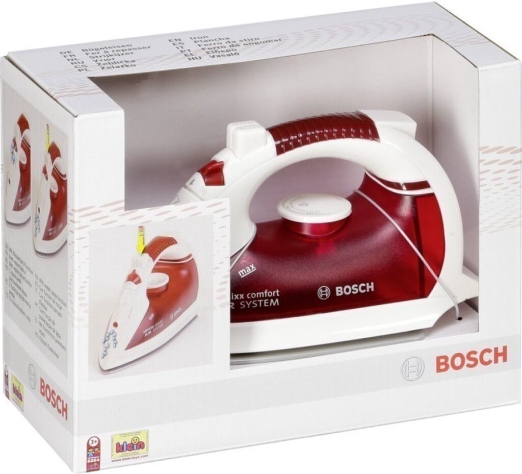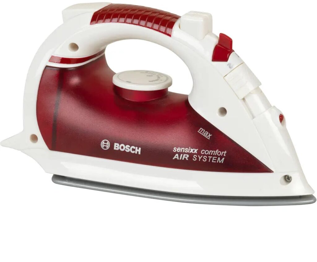 Veel plezier voor kleine huishoudhulpjes: Dit speelgoedstrijkijzer is overtuigend echt. Het heeft een tank die met water gevuld kan worden, een sproeifunctie die het strijkgoed op een speelse manier voorbereidt op het strijken, en de elegantie van Bosch.