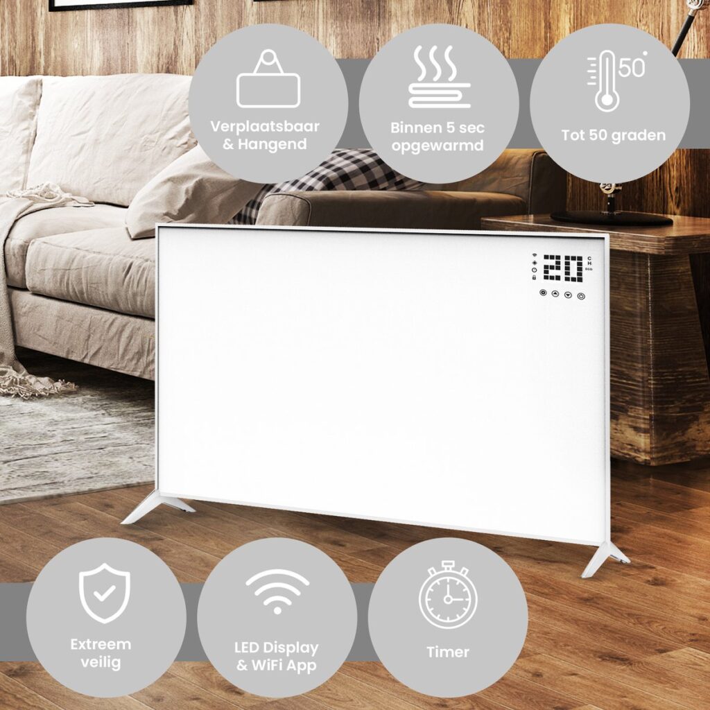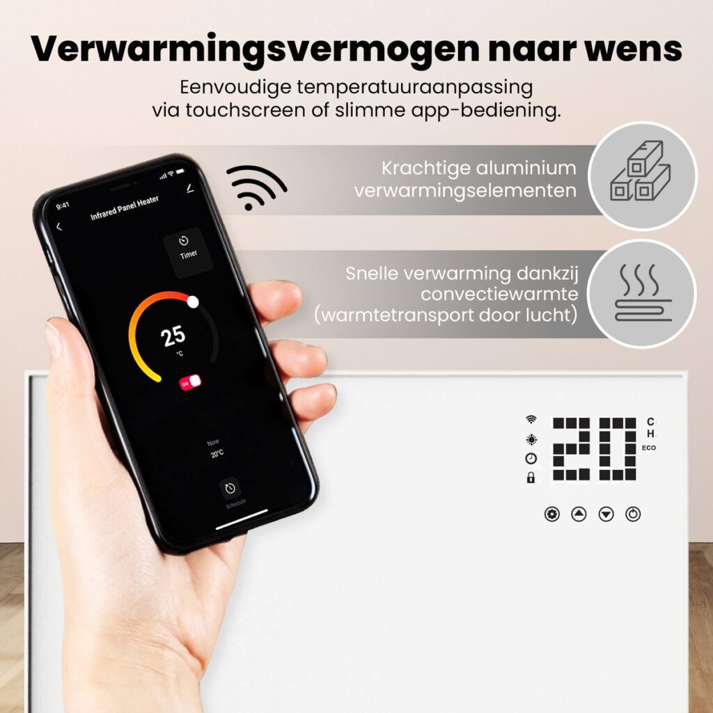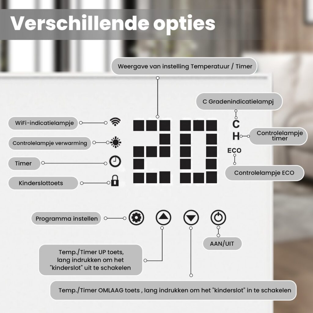 De ingebouwde kinderslot zorgt voor extra veiligheid door te voorkomen dat kinderen de instellingen per ongeluk wijzigen. Met de timerfunctie stel je precies in wanneer het paneel moet in- of uitschakelen, en de eco-modus helpt je energie te besparen door de verwarming efficiënt te regelen. Ook kun je het LED-display uitschakelen voor een ongestoorde nachtrust. Deze slimme functies maken het eenvoudig om je verwarmingsinstellingen aan te passen en te beheren voor maximaal comfort en veiligheid.