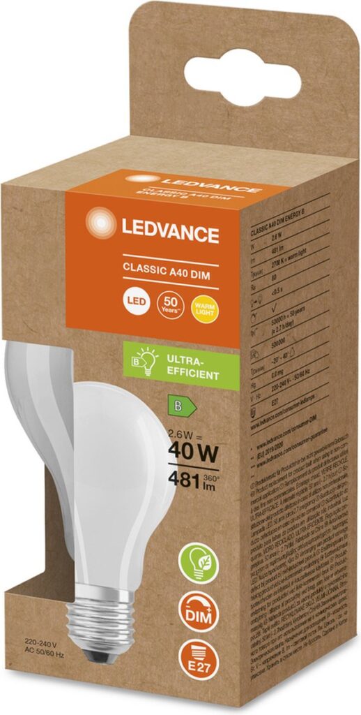 LED Lampen | Ledvance Classic Superior LEDbulb E27 Peer Filament Mat 2.6W 481lm – 827 Zeer Warm Wit | Dimbaar – Vervangt 40W (EAN: 4099854066221) spotgoedkoop en uit voorraad leverbaar! Wanneer u grotere hoeveelheden afneemt heeft u recht op onze staffelkortingen. Dit Ledvance product heeft een vermogen van 2.6 Watt (Watt staat voor het vermogen van de lamp en geeft aan hoeveel energie de lamp verbruikt). Deze lamp heeft een E27 socket/lampvoet. Alle lichtbronnen hebben een fitting, via deze fitting krijgt de lamp (lichtbron) de stroom die nodig is om licht te produceren. De fitting zorgt er ook voor dat de lamp gemakkelijk te vervangen is wanneer deze kapot gaat. Deze lamp heeft een ‘Peer’ vorm. Het product heeft de volgende kleurcode: 827 Zeer warm wit, in Kelvin is dat 2700K – Zeer Warm Wit. Het product type van dit product is: E27 LED. Het Ledvance product is bekend met kwaliteitslabel LED CLASSIC A ENERGY EFFICIENCY B D en productserie Classic Superior. Deze lamp heeft 481 Lumen met een Lumen/watt ratio van 185. Lumen is de maat voor de hoeveelheid licht van de lamp. Vroeger keek je naar ‘watt’, maar dat zegt tegenwoordig niet veel meer als je een lamp uitzoekt. Deze LED Lampen hebben een voltage van 220v. Volt is de meeteenheid van de elektrische spanning in een circuit tussen punt A en punt B. Sinds 1 september 2021 is er een nieuw energielabel in het leven geroepen. Dit nieuwe energielabel wordt bepaald aan de hand van de lumen/Watt efficiëntie. Hoe hoger de lumen/Watt efficiëntie, hoe beter het Energielabel. Dit Ledvance product heeft energielabel B. Deze lamp heeft een Color Rendering (RA) waarde van 89.. Het product kan gecategoriseerd worden onder: LED Lampen & LED Verlichting > Dimbare LED lampen. De officiële naam vanuit de fabrikant is LEDCLA40DIMEELB 2.6W 827FILFRE27 S LEDV. Ontdek ons brede en gevarieerde assortiment aan LED lampen & LED verlichting van topmerken als Noxion, Philips en Osram. Ben je op zoek naar een duurzame en energiezuinige lichtbron? Kies dan voor LED! De aanschaf van een LED lamp verdien je in de meeste gevallen binnen een jaar alweer terug. Daarnaast staat LED verlichting bekend om zijn lange levensduur. Hierdoor ben je voor een langere periode vrij van kosten aan vervanging en onderhoud. Een voordeel dat er onmiddellijk uitspringt, is het lage wattage van LED lampen. Dit zorgt ervoor dat een LED lamp veel minder energie verbruikt, terwijl het toch dezelfde prestaties levert als een conventionele lamp, die veel meer vermogen nodig heeft.