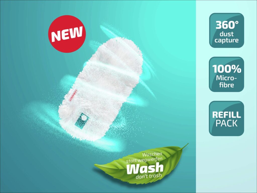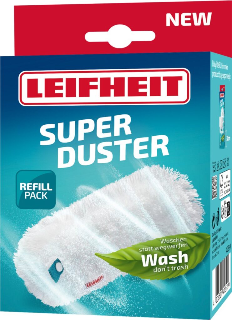 Leifheit overtrek voor plumeau SUPERDUSTER, een ideale combinatie van duurzaamheid, efficiëntie en gemakkelijk werken. De textiel 360°-stofborstel bestaat uit hoogwaardig microvezel, dat stof, haren en allergenen uitstekend opneemt en vasthoudt in de vezels. Deze stofdoek voor de plumeau is wasbaar en kan 50 keer op 40°C in de wasmachine gewassen worden. Zo bespaar je geld, want je hebt geen wegwerpdoeken nodig, en je helpt het milieu, want je hebt minder afval. Ook na meerdere keren wassen blijven de reinigingsprestaties van de plumeau volledig behouden. Laat het vuil niet rondwervelen, maar houdt het stevig vast. Reiniging en onderhoud van het textieldeel van plumeau SUPERDUSTER is supergemakkelijk: wassen, en dan het textiel even opschudden en laten drogen, zodat het zijn vorm weer terugkrijgt en weer flexibel en fluffy is. Het textieldeel van plumeau SUPERDUSTER heeft een brede en een smalle kant, voor grondig afstoffen van voorwerpen en makkelijke toegang tot smallere tussenruimtes. De praktische drukknop-bevestiging zorgt ervoor dat het textieldeel snel en simpel van de greep los te maken is, en net zo makkelijk weer bevestigd kan worden. Zo is de plumeau snel klaar voor gebruik – voor afstoffen op een schone en duurzame manier.