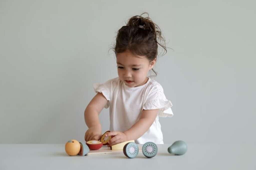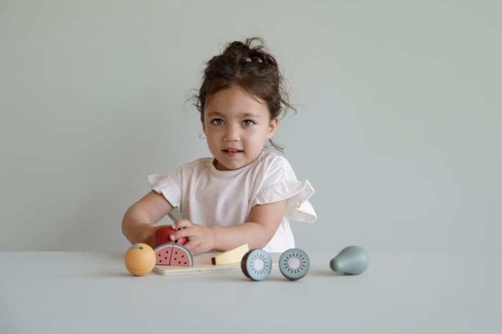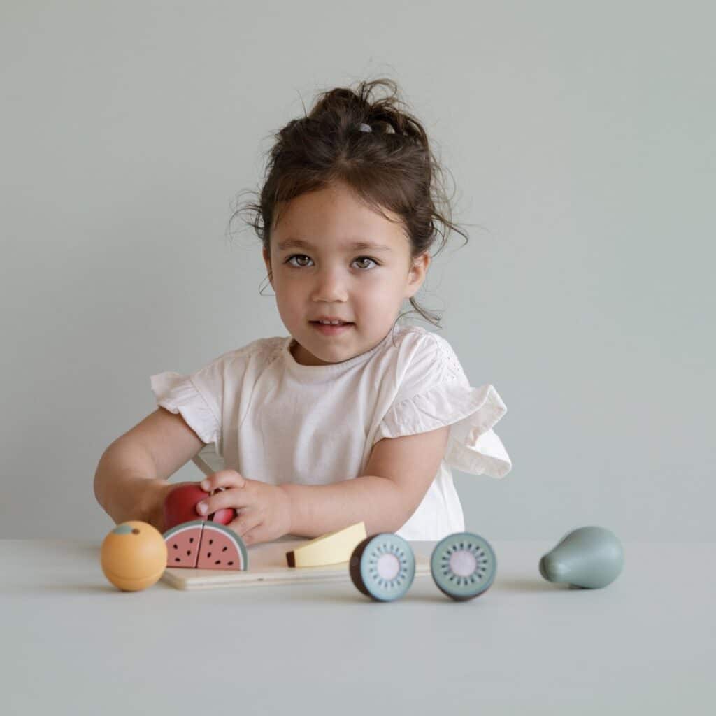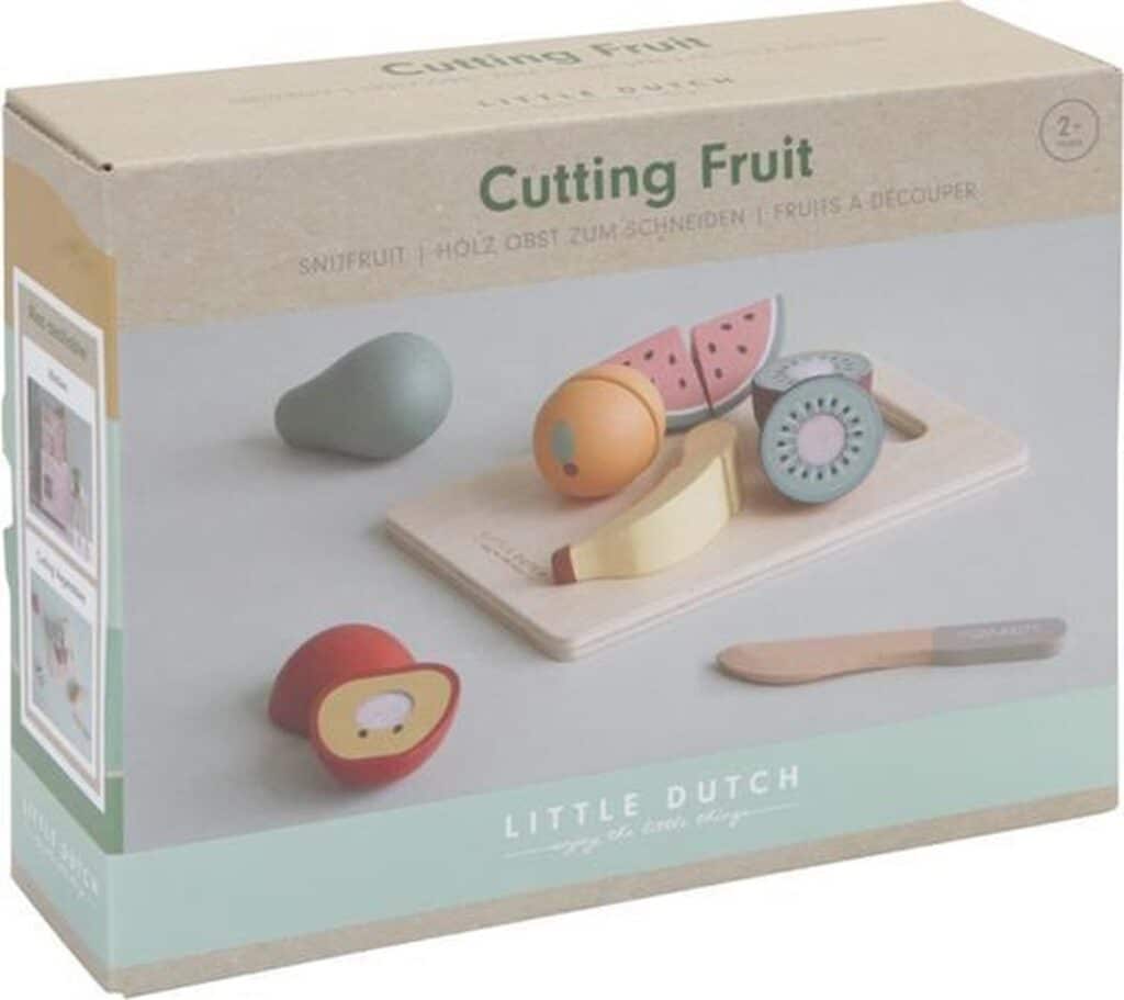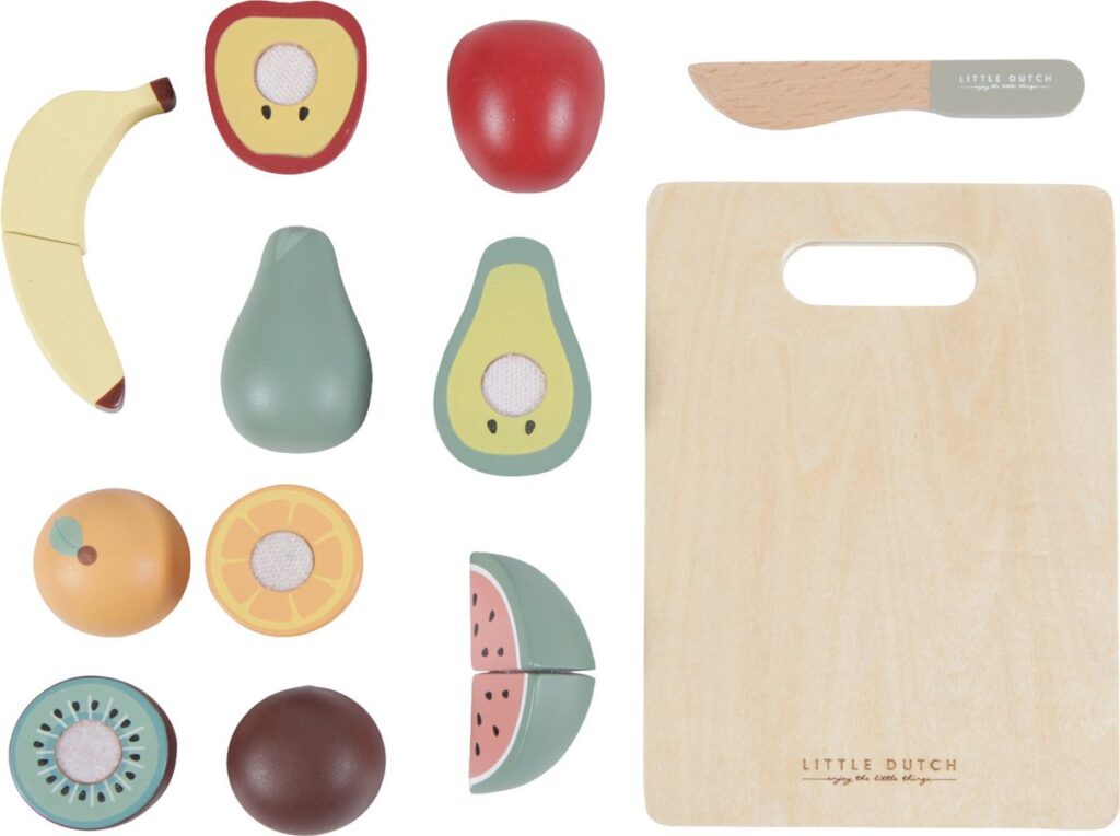 • Inhoud verpakking Snijplank, houten mes, appel, banaan, kiwi, peer, sinaasappel, watermeloen