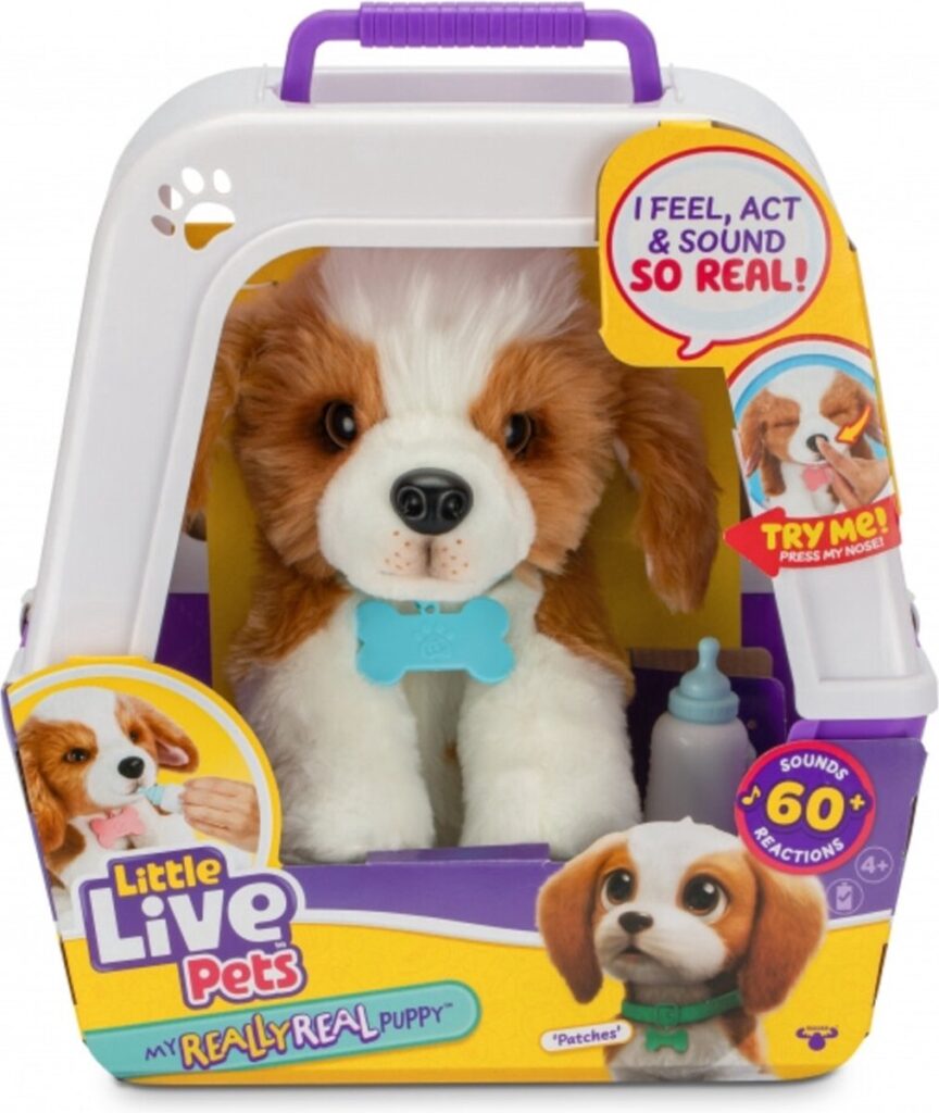 Little Live Pets My Really Real Puppy met de naam Patches, is de meest echte puppy die je ooit hebt gezien! Patches ziet er zo echt uit en voelt zo echt aan met zijn zachte vacht en de liefste knipperende ogen. Hij reageert op jouw aanraking met meer dan 60 geluiden en reacties.