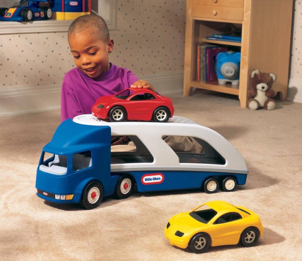 Toet-toet, beep-beep! Met de Little Tikes grote autotransporter kun je in de woonkamer of achtertuin auto’s vervoeren naar de autorace! Met de eenvoudig te gebruiken laadklep kunnen kinderen twee sportwagens in de autotransporter laden en naar de autorace rijden! Koppel de oplegger los van de truck voor nieuwe manieren om te spelen! Het speelgoedvoertuig is inclusief 2 sportwagens.