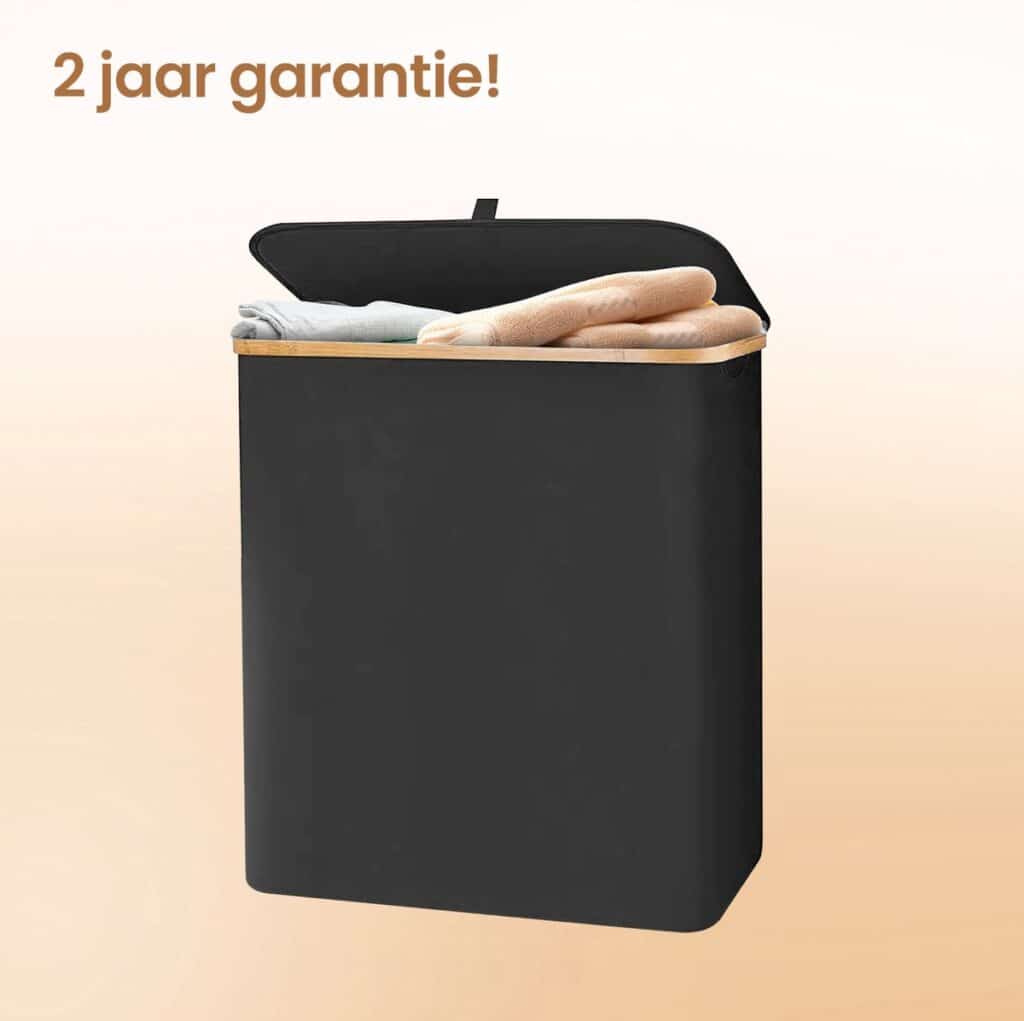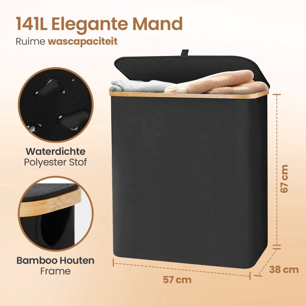 Lugia Wasmand 2 Waszakken 141L – Natuurlijk Bamboe – Wasmand met Deksel – Wassorteerder – Zwart