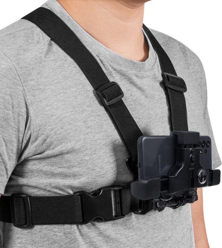 De houder, waarmee je je smartphone, camera, GoPro camera en andere apparaten op je borst kunt bevestigen, is een geweldige optie voor actieve mensen die een oplossing nodig hebben voor het opnemen van hun sportieve prestaties zonder dat ze het apparaat in hun hand hoeven te houden of aan een helm hoeven te bevestigen. Het enorme verstelbereik, het compacte formaat en het bescheiden gewicht betekenen dat elke gebruiker niet eens het gevoel heeft dat hij het harnas draagt met het apparaat eraan bevestigd.