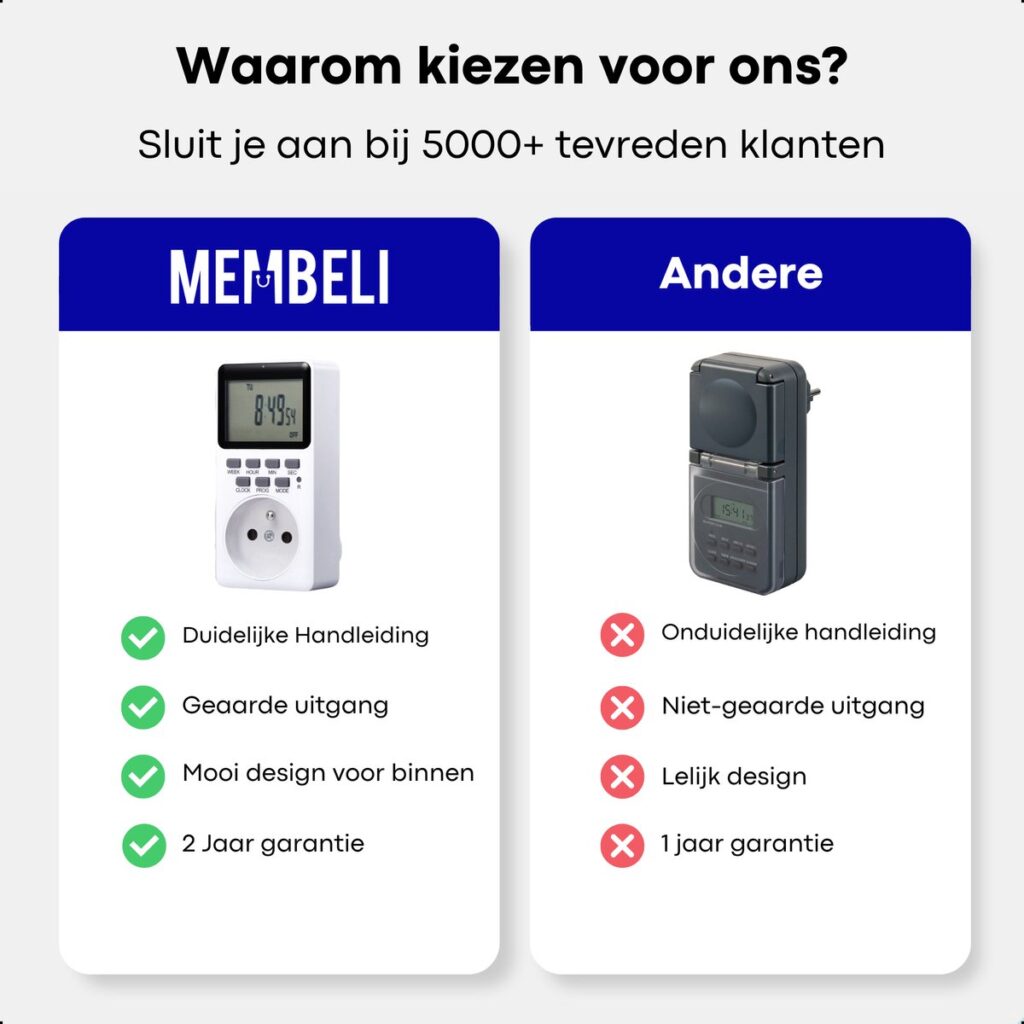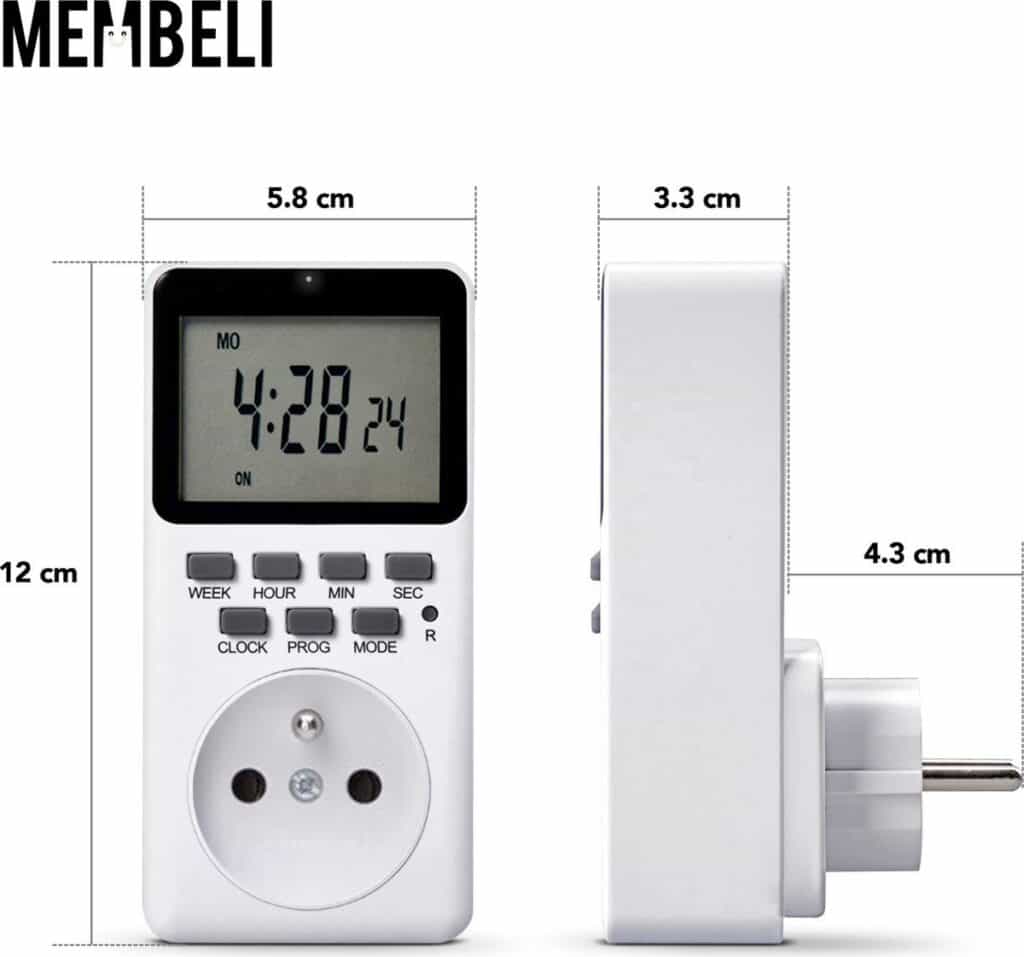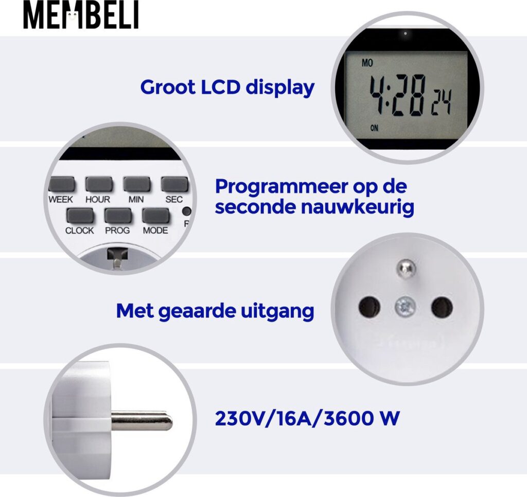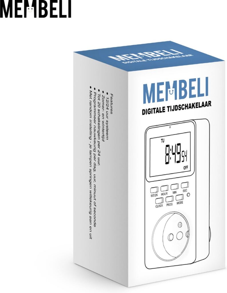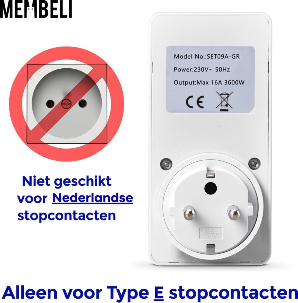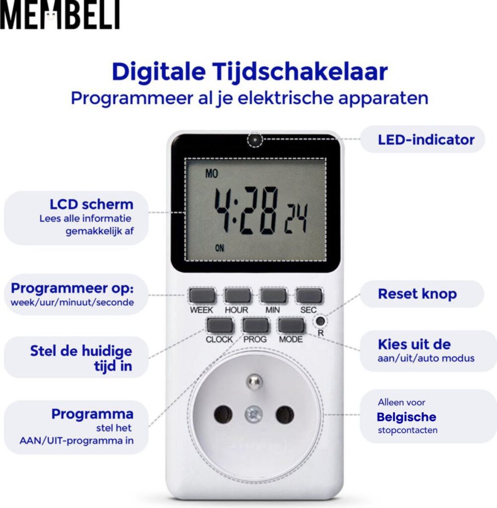 Let op: geschikt voor Belgische stopcontacten, niet voor Nederlandse (alleen geschikt voor type-E stopcontacten). Heb je een tijdschakelaar voor Nederland nodig? Zie onze andere Membeli Tijdschakelaars.
