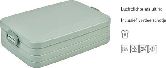 De grote Mepal broodtrommel is ontworpen om je lunch mee te nemen voor onderweg. Hij is voorzien van een afdichtring die de inhoud altijd lekker vers houdt en een verdeelschotje, waarmee etenswaren eenvoudig van elkaar kunnen worden gescheiden. Deze lunchbox large is beschikbaar in verschillende trendy kleuren en maten, waardoor er voor iedereen een lunchbox is die bij je past!