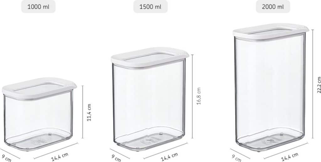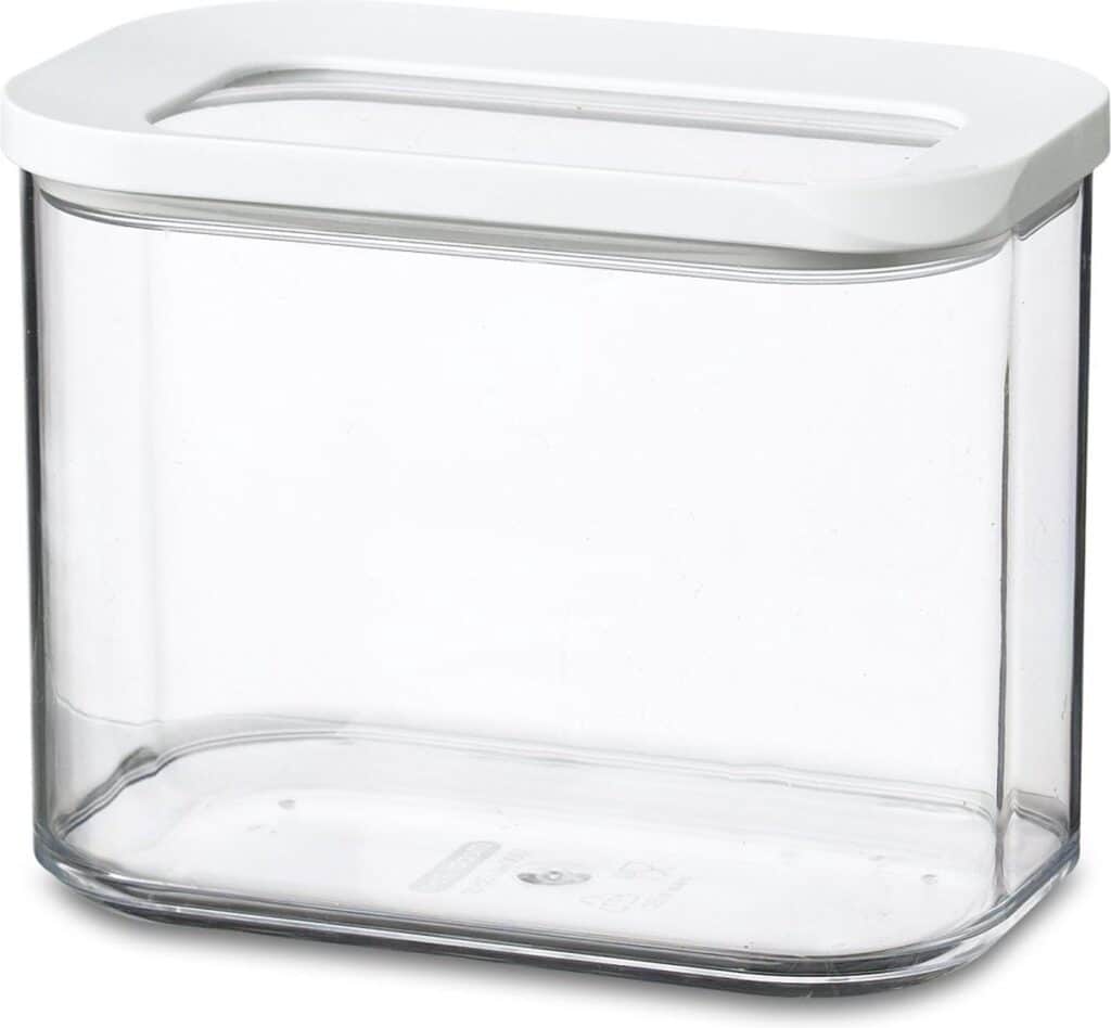 De praktische en stijlvolle Modula bewaardoos van 1000 ml voorzien van een doorzichtige deksel met witte ring geeft direct zicht op de inhoud van de bewaardoos. De witte afdichtring zorgt voor een perfecte afsluiting, waardoor deze voorraaddoos geschikt is voor het bewaren van droge etenswaren zoals koffiebonen, pasta, koekjes of bloem.