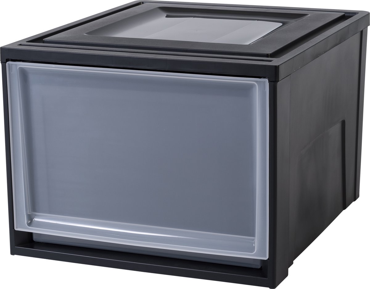De Maxi Drawer is een handig, modulair stapelbaar opslagsysteem waarin design, kwaliteit en functionaliteit elkaar tegen komen. De lades zijn voorzien van een inkeping waardoor je deze makkelijk opent en een stopper zodat de lade er niet uitvalt. Door de transparante lade kan je in een oogopslag de inhoud zien. Specificaties • Afmetingen: L450xB390xH295mm • Licht in gewicht • Makkelijk te reinigen • Bestaat voor 56% uit gerecycled materiaal • Inhoud per lade: 40 liter • Stapelbaar