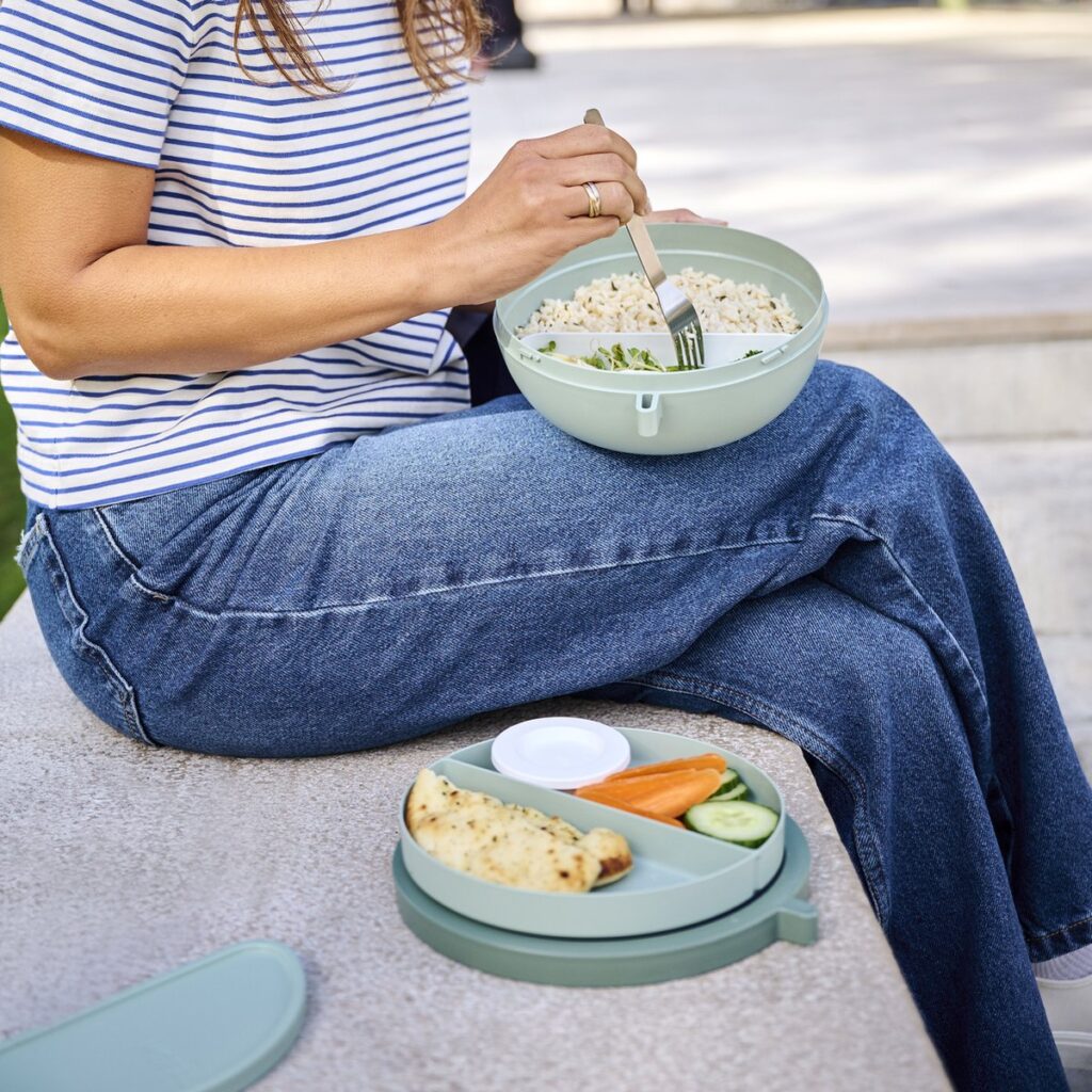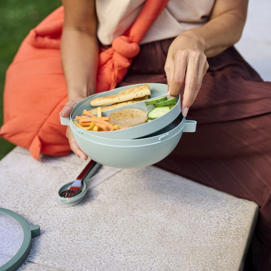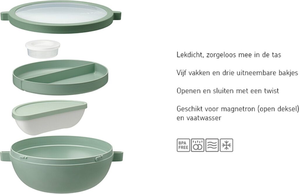 Neem de lekkerste lunch mee in de stijlvolle Mepal Vita bento lunchbowl. De bento box in de trendy kleur Nordic sage is ideaal om je lunch vers te houden. Zin in een warme maaltijd? De lunchbox mag met de deksel los erop in de magnetron. Deze bento bowl heeft maar liefst 5 vakken en 3 verschillende uitneembare compartimenten. Het kleine bakje is perfect om te vullen met een dressing of toppings. Je favoriete salade neem je mee in het grote compartiment met deksel. En in de tray kan je extra snacks meenemen. Door de unieke schroefdeksel is de bento lunchbowl lekvrij en kan die zorgeloos mee in je tas.