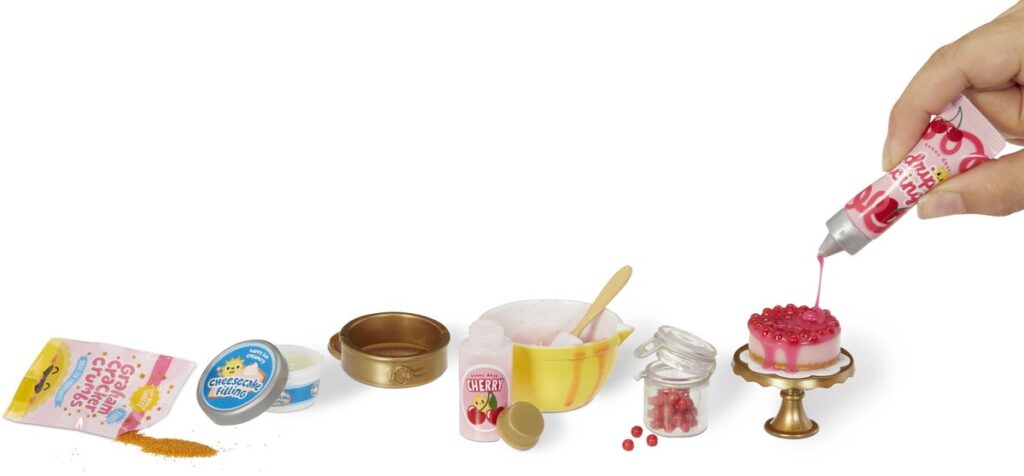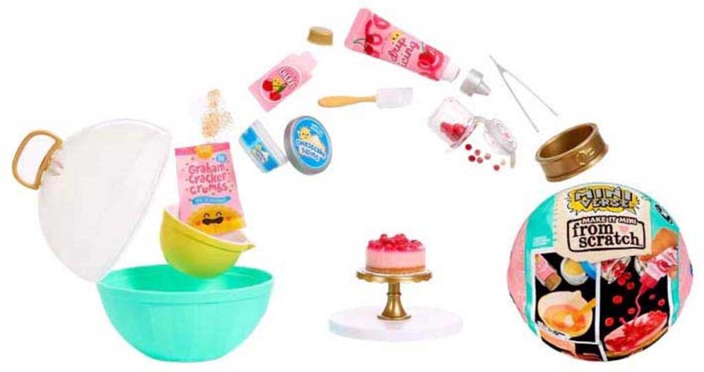 Bereid je voor om op te kloppen, te rollen en laagjes te maken met Make It Mini From Scratch™ van MGA’s Miniverse™! Combineer bakplezier met een hele wereld aan miniaturen om te verzamelen! Van taarten en stokbroden tot pannenkoeken en pasta, deze serie geeft een overheerlijke twist aan je zoete minicreaties. MGA’s Miniverse™ zijn de ORIGINELE miniatuurverzamelvoorwerpen die je kunt MAKEN, HARD LATEN WORDEN en LATEN ZIEN! Elke verrassingscapsule zit barstensvol realistische mini-‘ingrediënten’ en accessoires waarmee je zoete en hartige lekkernijen kunt maken… van scratch af aan! Je weet pas welke miniatuur je krijgt als je hem uitpakt! Er zijn 12 recepten voor voedselminiaturen in deze serie om te verzamelen!Geniet van bakplezier bij elke stap! Meng, maak laagjes, rol uit en stel je miniaturen samen met behulp van de inbegrepen ‘onbewerkte ingrediënten’. Van pastadeeg uitsteken tot de lagen van een cheesecake maken, het draait allemaal om het proces. Vergelijk je ingrediënten met de inbegrepen verzamelgids om te weten welke mini je hebt gekregen en volg de aanwijzingen van de ‘receptenkaart’ op de achterkant om je creatie te maken. Laat je miniatuur zo lang als op de receptenkaart staat aan de lucht drogen. Nu heb je een verzamelvoorwerp dat je aan iedereen kunt laten zien! Zet je Miniverse-creatie in je capsule met het deksel om deze langer ‘vers’ te houden! Er is meer om te verzamelen dan alleen je miniatuur! Van miniaturen van mengkommen en deegrollers tot dozen cakemix en pastaverpakkingen, stel je eigen miniatuurkeuken samen met heel veel unieke ingrediënten en accessoires. Er zijn talloze unieke Make It Mini™ From Scratch-ingrediënten, -verpakkingen en -keukenaccessoires om te verzamelen en je eigen collectie miniatuurmeesterwerken samen te stellen. DISCLAIMER: de ingrediënten zijn NIET eetbaar. Niet geschikt voor kinderen jonger dan 8 jaar.