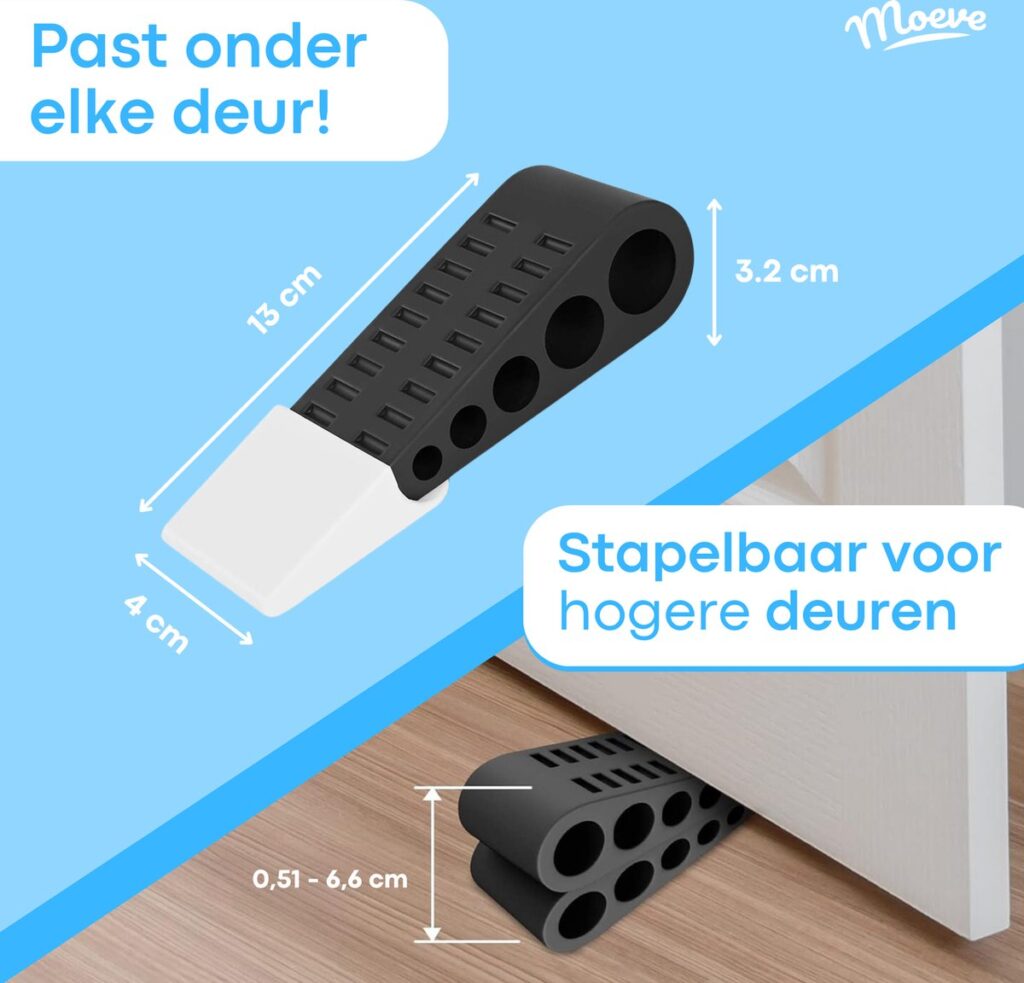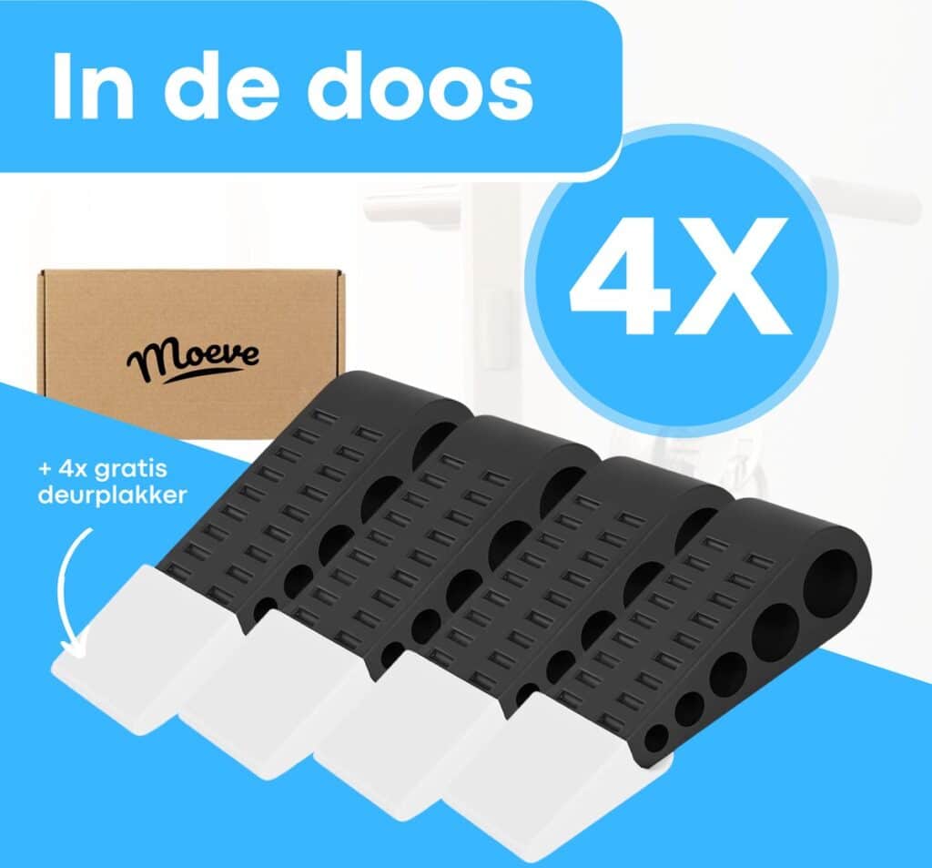 De Moeve deurstoppers worden geleverd in een handige set van vier. Met deze set heb je zes deurstoppers tot je beschikking, waardoor je zowel de voordeur als achterdeur (en andere deuren) gemakkelijk open kunt houden, zonder gedoe of irritatie.