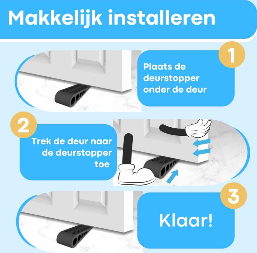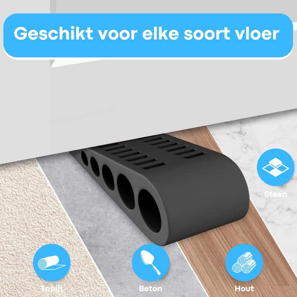 Of je nu een harde vloer hebt zoals laminaat of tegels, of tapijt, onze deurstoppers zijn geschikt voor alle vloertypen. Ze bieden een stevige grip en voorkomen dat de deur ongewenst dichtvalt, ongeacht het oppervlak.