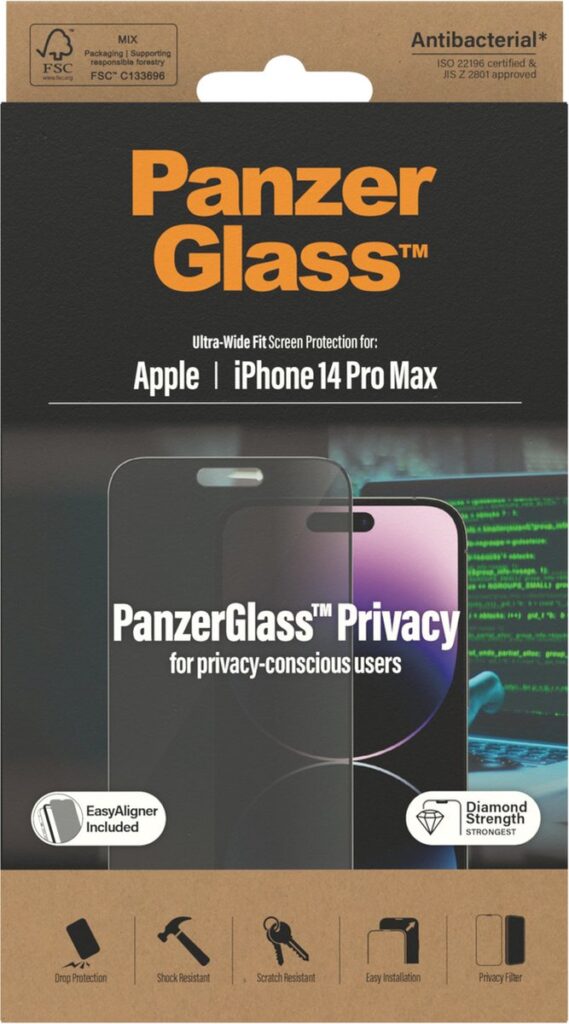 Als je niet wilt dat anderen nog op jouw scherm mee kunnen kijken is deze speciale privacy screenprotector een perfecte oplossing. Bij gebruik van deze screenprotector kan je alleen nog vanaf recht voor het toestel zien wat er op het scherm staat. Vanaf de zijkant gezien is er alleen een donkere gloed zichtbaar. Houd je Apple iPhone 14 Pro Max voortaan prive en voorkom dat anderen meekijken met deze unieke PanzerGlass Ultra-Wide Fit privacy screenprotector.