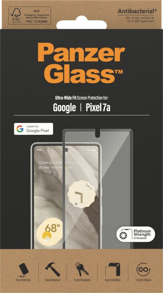 Naast het beschermen van alleen je Google Pixel 7A, beschermt deze screen protector jou ook! De PanzerGlass Ultra-Wide Screen Protector heeft een speciale coating die 99,99% van alle veelvoorkomende oppervlaktebacteriën elimineert en ook geen kans laat op vette vingerafdrukken. Deze oersterke tempered glass biedt de bescherming die je gewend bent van PanzerGlass maar is ook case friendly. Zelfs het milieu profiteert van de FSC-gecertificeerde verpakkingen, die afkomstig zijn uit duurzame bosbouw en gemakkelijk kunnen worden gerecycled.
