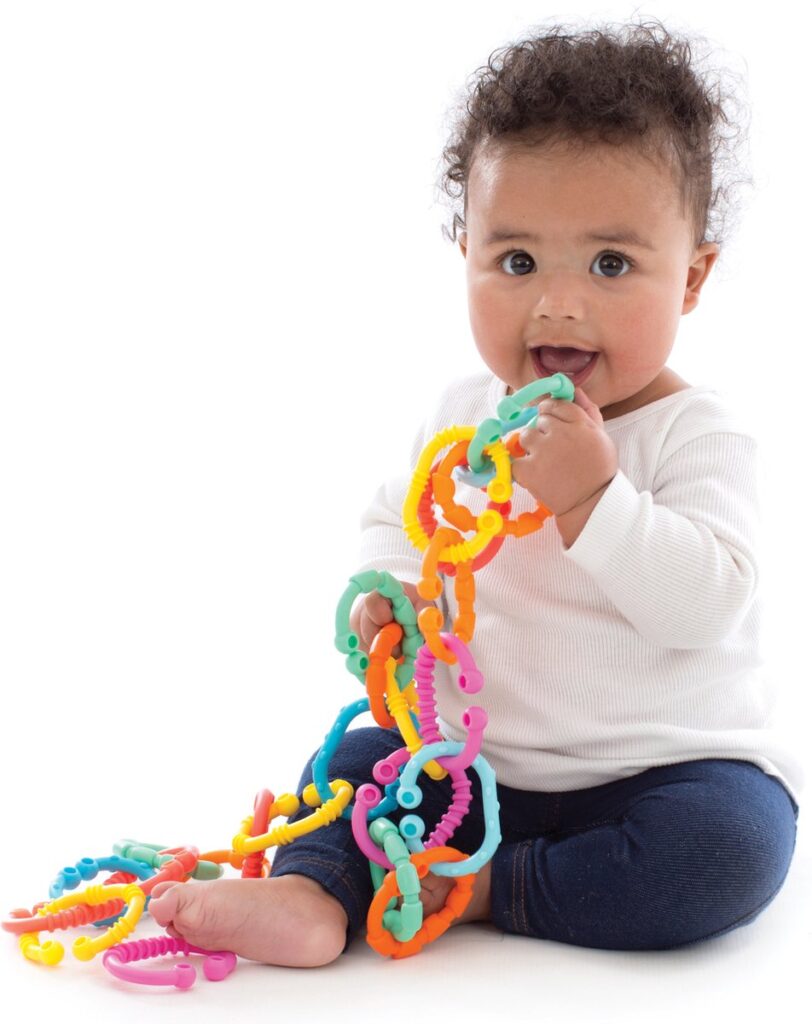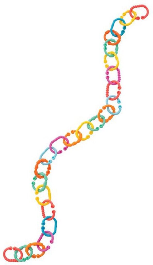 Speelketting met 24 gekleurde ringen; om op te hangen aan de kinderwagen of wieg; leerspeelgoed voor de stimulering van de grove en fijne motoriek; ideaal voor het oefenen van het gezichtsvermogen, gehoor en de tastzin – Voor veelzijdig speelplezier: 24 ringen met verschillende structuren om vast te pakken; voor het bevestigen van knuffels en andere voorwerpen; om uit elkaar te halen en opnieuw vast te maken – Ook geschikt als bijtringen: ideaal voor het verzachten van de pijn van doorkomende tandjes; verschillende structuren voor het masseren van gevoelig tandvlees – Gemaakt van een stevig en duurzaam materiaal; gemakkelijk te reinigen in warm water met zeep