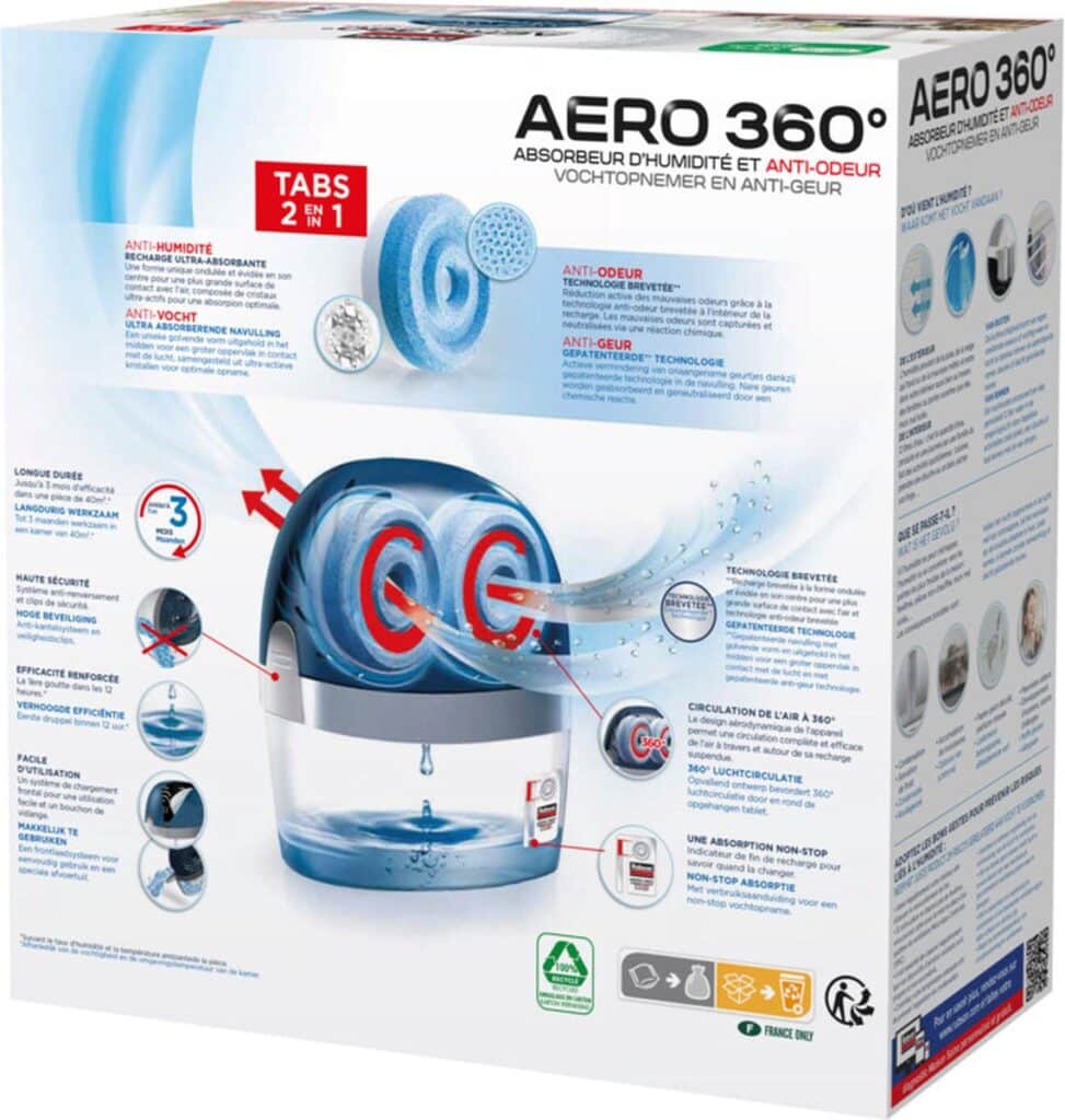 De extreem absorberende vochtvreter AERO 360 heeft een vernieuwde golfvorm en een centrale opening om de contactoppervlakte te vergroten. De AERO 360 vochtvreter is bijgevoegd in de verpakking. Aangeraden voor vochtige ruimtes en een perfecte vochtvreter voor in huis maar ook ruimtes zoals:badkamers, keukens, wasplaatsen, bergruimtes, kelders, garages, wijnkelders, ateliers, tuinhuisjes, schuren, leefruimtes, vakantiehuizen, caravans, camping-cars, boten.