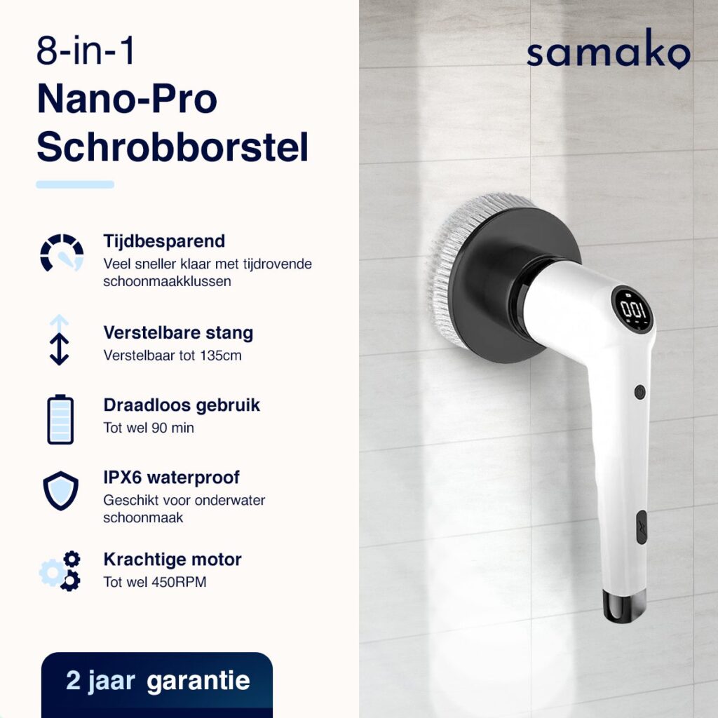 Ben je op zoek naar een moeiteloze manier om je huis tot in de puntjes schoon te krijgen? Maak kennis met de nieuwste innovatie in schoonmaaktechnologie: de elektrische schrobborstel NanoPro. Met zijn geavanceerde functies en slim ontwerp biedt deze krachtige schrobborstel een grondige reiniging voor elk oppervlak in je huis. Laat de zorgen over hardnekkig vuil achter je en verwelkom een nieuwe standaard van schoonmaken met de Samako schrobborstel.