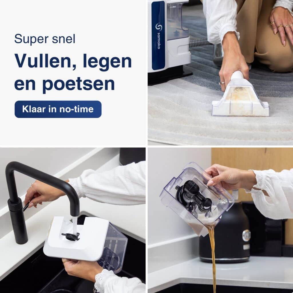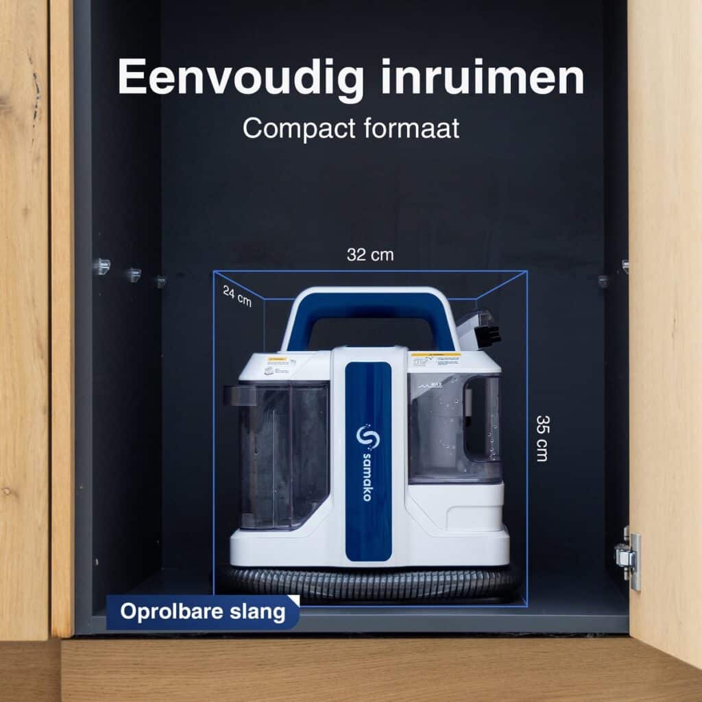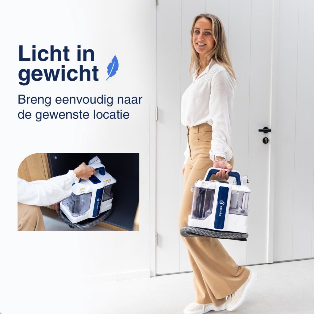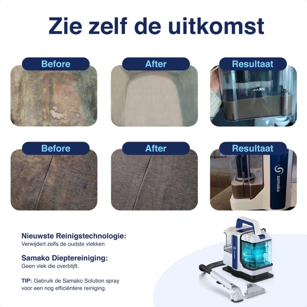 Met de Samako vlekkenreiniger verwijder je gemakkelijk viezigheid en krijgt jouw object tot in de puntjes een grondige reiniging. Onze geavanceerde reiniger heeft een extra krachtige motor, hoogwaardige aqua-jets en extra sterke borstelharen. Dit zorgt voor een extra diepe reiniging van het oppervlak tot wel 6 centimeter. (ook bij vlekken die al langer in het oppervlak zitten).