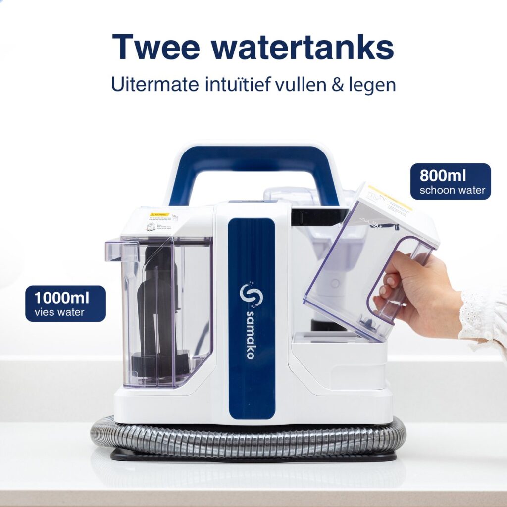 De Samako tapijtreiniger is uitgerust met 2 handige uitneembare watertanks, waardoor je moeiteloos water kunt bijvullen en het vuile water kunt verwijderen. Met een ruime schoonwatertank van 0.8 liter en een handige vuilwatertank van 1.0 liter, beschik je over voldoende capaciteit om zelfs grote oppervlakken grondig te reinigen. De tapijtreiniger spuit automatisch schoon water op het oppervlak en zuigt vervolgens het vuile water op, dat veilig wordt opgeslagen in de vuilwatertank. Deze directe zuigwerking zorgt ervoor dat het gereinigde oppervlak snel droogt, zodat je snel kunt genieten van een fris resultaat