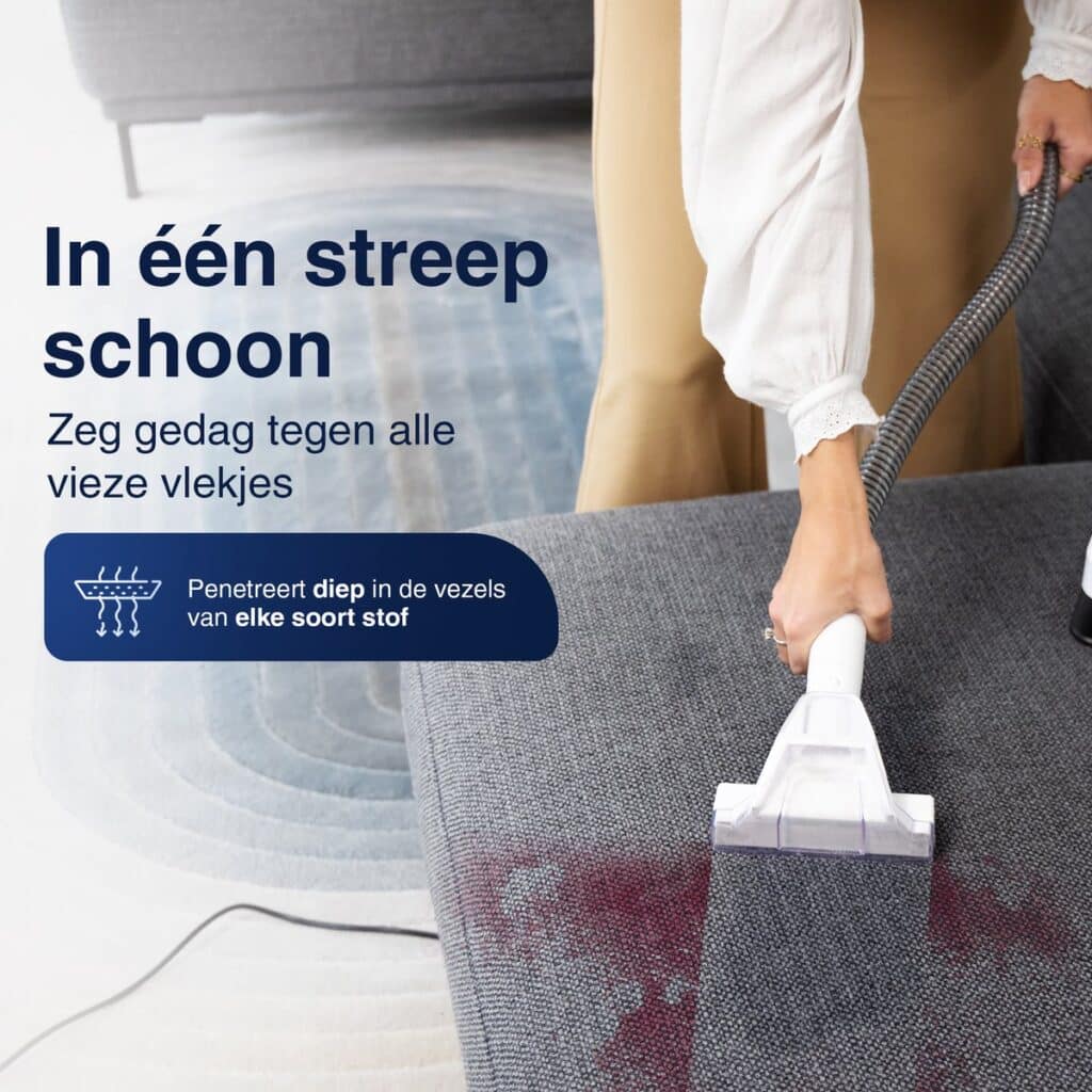 Onze vlekkenreiniger begrijpt jouw frustraties als geen ander. Het reinigingshulpstuk is ontwikkeld met jouw behoeften in gedachten. Dankzij de ingebouwde sproeier kun je de vlekken direct aanpakken. De hoogwaardige borstels schrobben grondig over het oppervlak dat je wilt reinigen en zuigen tegelijkertijd al het vuil moeiteloos op. Wat dit nog beter maakt, is dat de reiniger zacht is voor verschillende soorten stoffen, zoals katoen, linnen, leer en synthetische materialen. Zo kun je vlekken verwijderen zonder je zorgen te maken over beschadigingen.