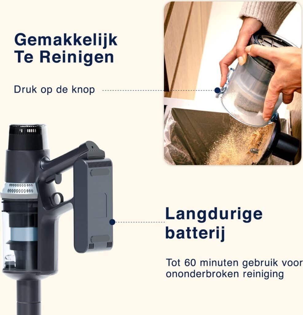 Met de CleanDetect ervaar je de ultieme vrijheid tijdens het schoonmaken. Het draadloze ontwerp betekent dat je nooit meer last hebt van lastige snoeren of beperkt wordt door stopcontacten. Dankzij het ultralichte gewicht van slechts 3,3 kg manoeuvreer je moeiteloos door het hele huis, van de woonkamer tot de trap. De compacte en wendbare vorm maakt het schoonmaken van moeilijk bereikbare plekken zoals onder meubels eenvoudig, wat je dagelijkse schoonmaakklus een stuk comfortabeler maakt.