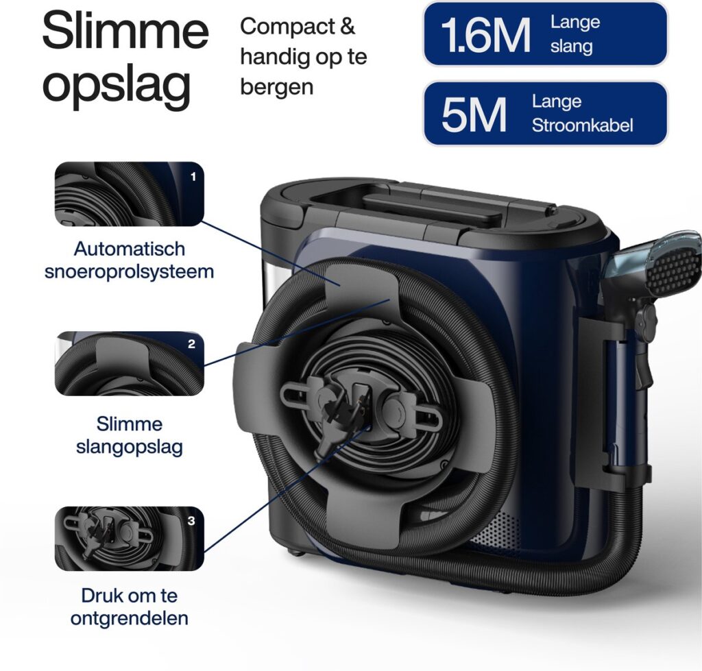 Dankzij de meegeleverde accessoires pas je het apparaat eenvoudig aan op elke situatie. Of het nu gaat om diep ingetrokken vlekken in tapijt of precisiewerk in smalle ruimtes — je hebt altijd het juiste opzetstuk bij de hand.