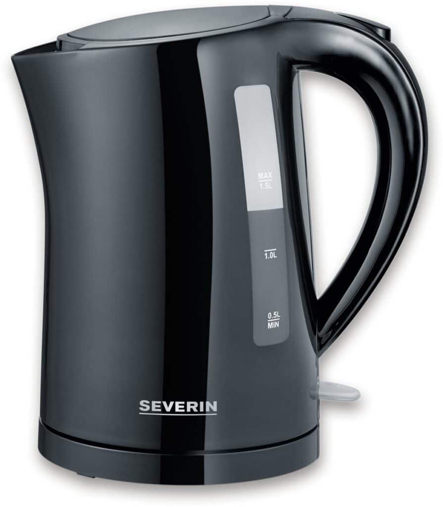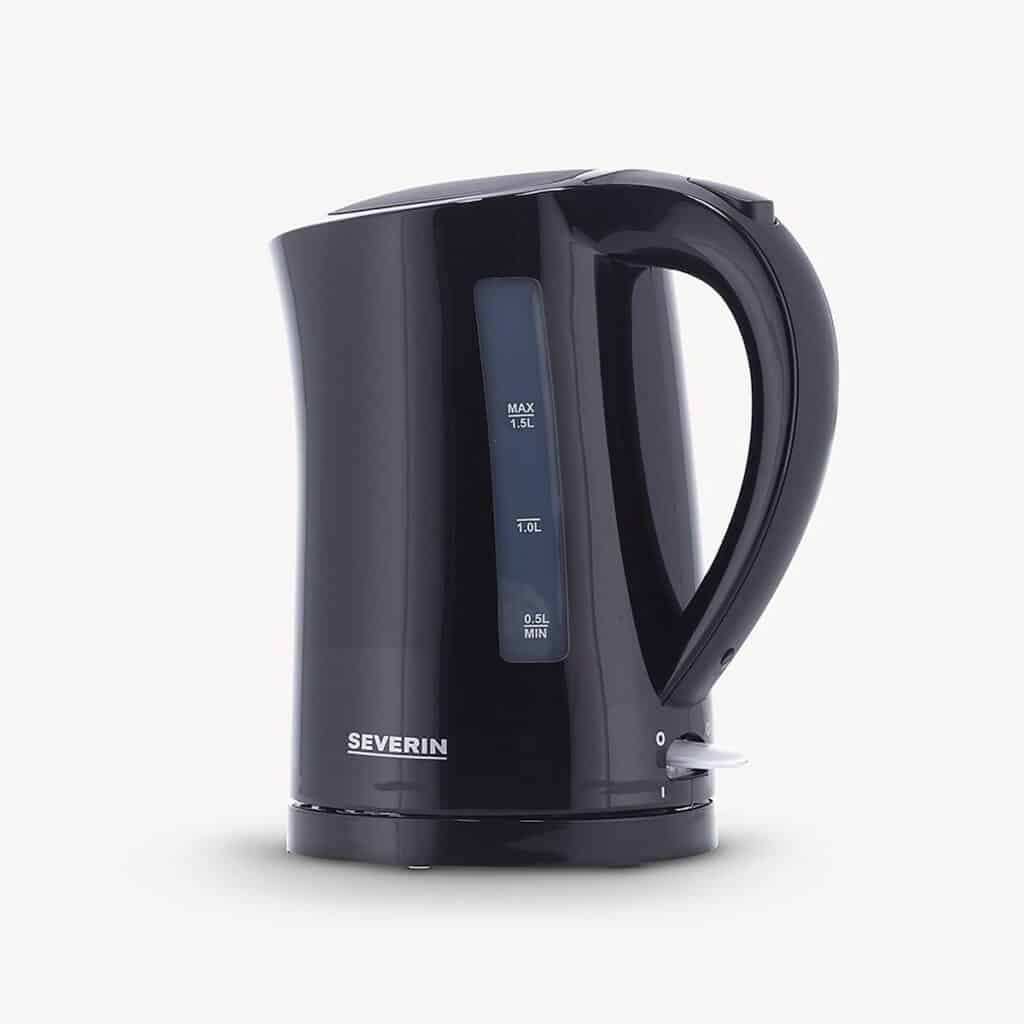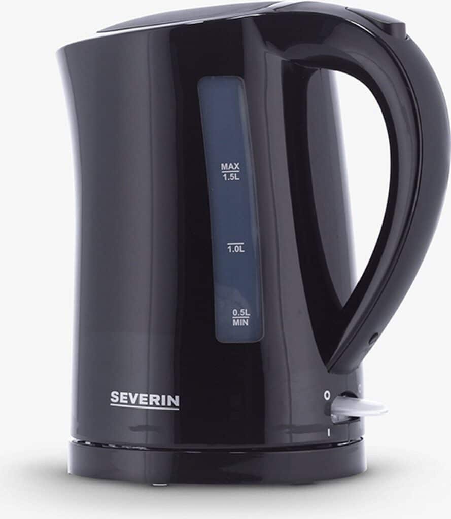 De Severin WK3498 waterkoker heeft een inhoud van 1.5 liter. De waterkoker heeft een strakke design en is zwart. De waterkoker heeft een 360° central snoerloos systeem. De waterkoker kan snoerloos uit elke richting op de apparaatsokkel worden gezet.