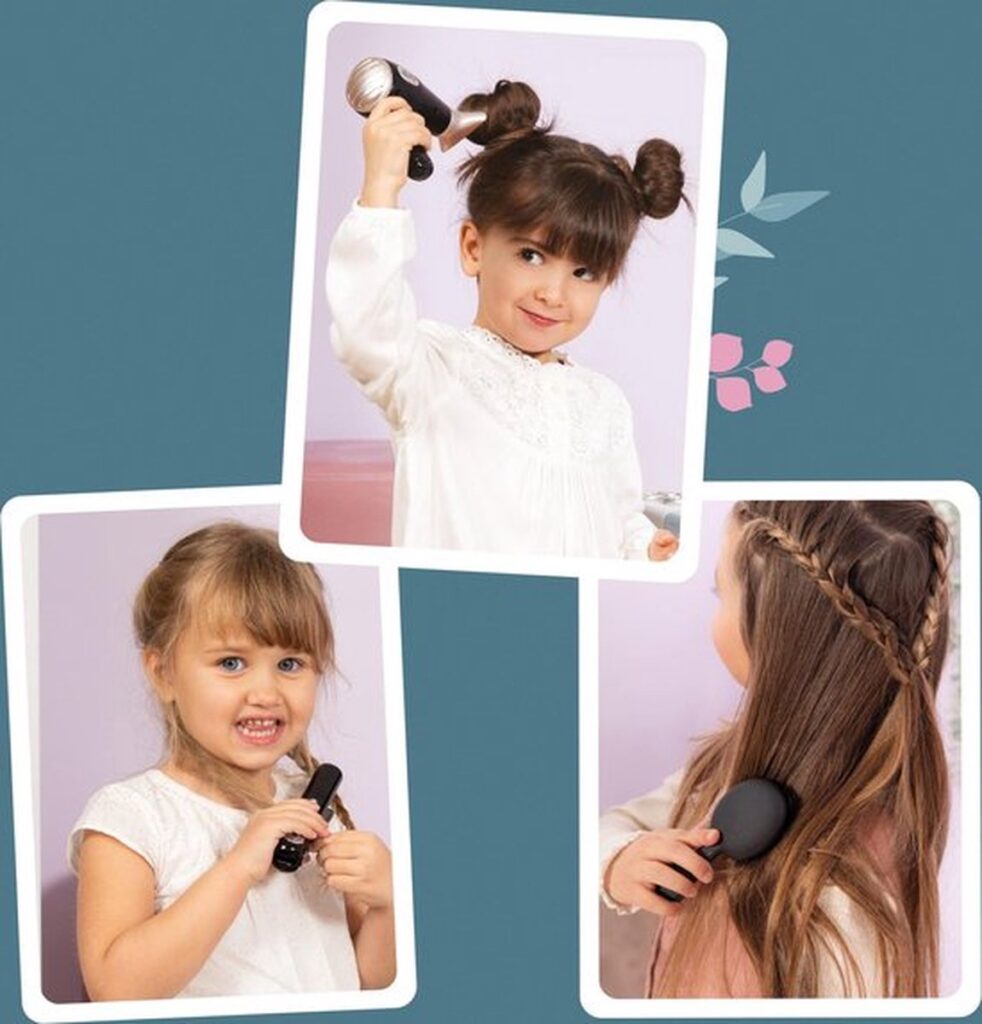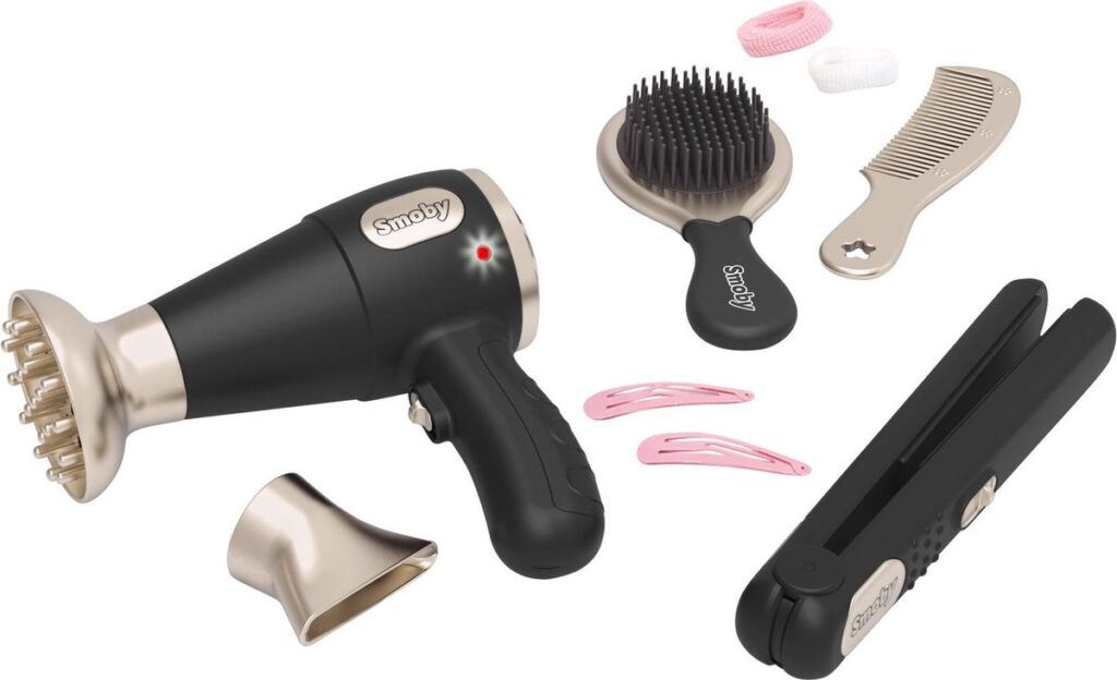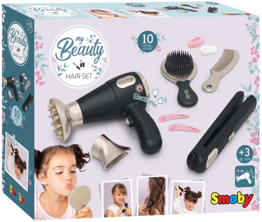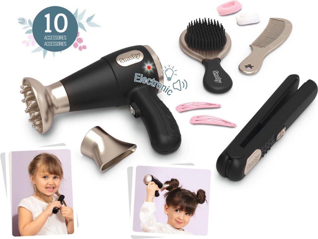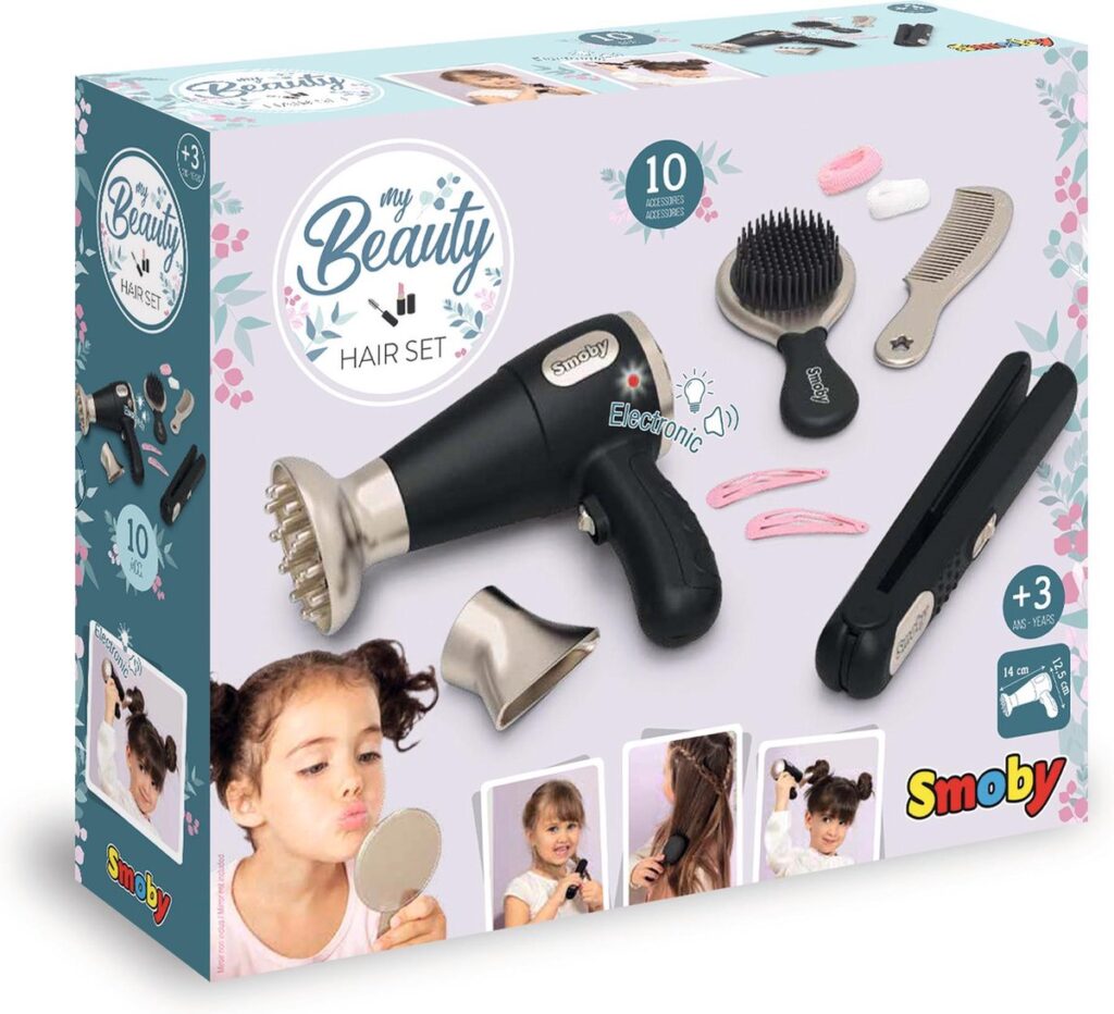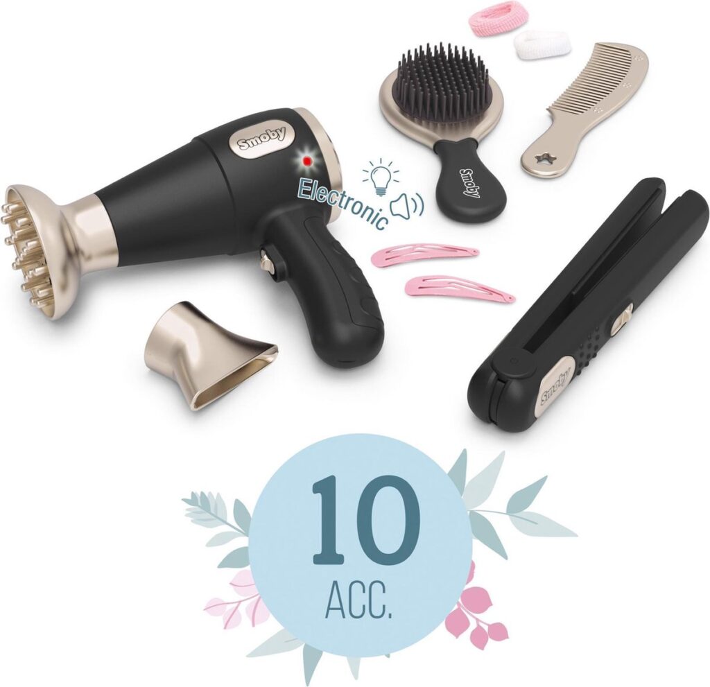 Creëer mooie kapsels met je Smoby-kapselset! Je hebt alles bij de hand om je haar te stylen: 1 elektronische föhn met 2 punten, 1 stijltang, 1 borstel, 1 kam, 2 elastieken en 2 haarspeldjes. De föhn heeft licht- en geluidsfuncties als een echte! Je kunt ook kapper spelen en voor je vrienden zorgen! 2 LR03 batterijen niet inbegrepen. Vanaf 3 jaar.