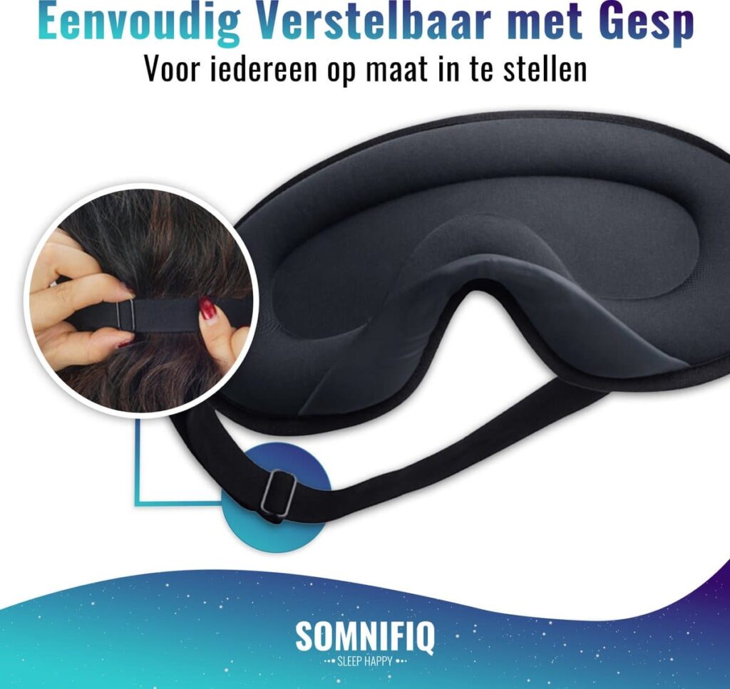 Wie wil er nu niet heerlijk uitgerust wakker worden?! Een goede nachtrust zorgt voor veel gezondheidsvoordelen. Bovendien is een uitgerust mens gewoon gelukkiger. Twee belangrijke factoren die een goede nachtrust bevorderen zijn duisternis en stilte. Het Somnifiq 3D slaapmasker inclusief oordopjes komt hier dus goed bij van pas. Het 3D slaapmasker heeft een uniek ontwerp met maar één gat voor beide ogen. Dit zorgt voor optimaal comfort tijdens het slapen en voorkomt druk op je ogen en wimpers. De combinatie van traagschuim en zijde zorgen voor een heerlijk zacht slaapmasker, zo licht als een veertje (37gr) en 100% verduisterend. De verstelbare gesp zorgt ervoor dat het masker voor iedereen een comfortabele pasvorm kan aannemen. En geen zorgen over haarbreuk want we gebruiken geen klittenband in ons ontwerp!